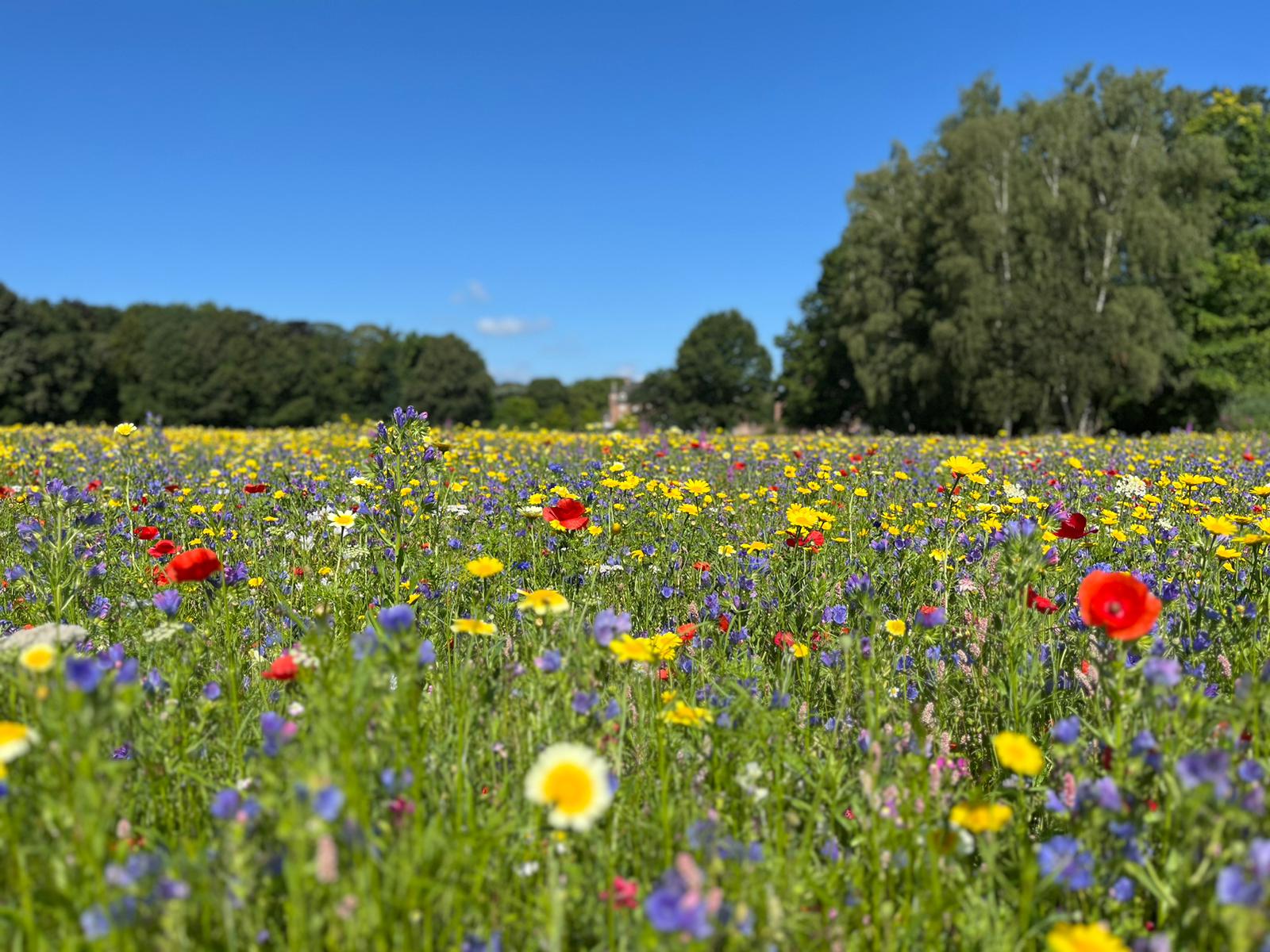 Seit einigen Wochen blühen unsere Kiepenkerl-Mischungen `Ländliche Blütewelle` und `Wildblumenmischung` auf über 1 Hektar Fläche im Landschaftspark der Wasserburg Anholt.