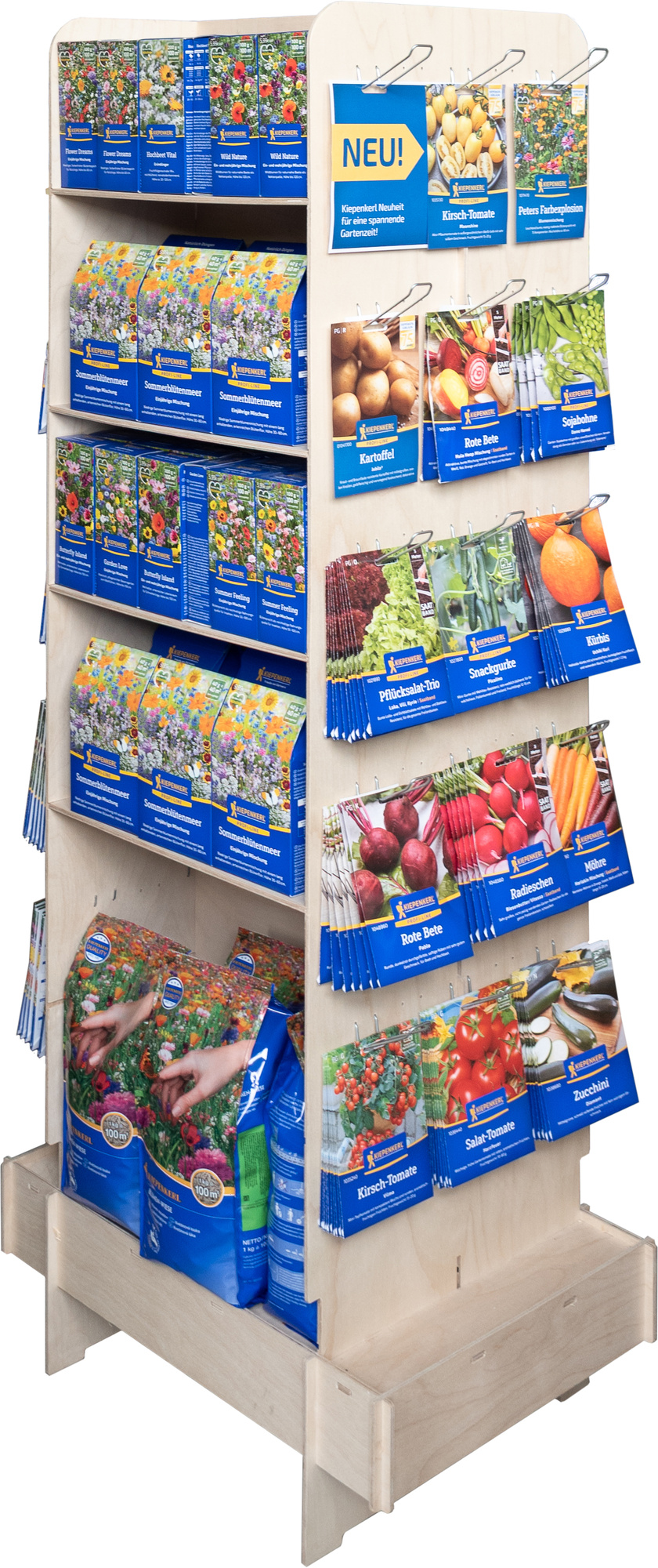 75 Jahre Kiepenkerl – feiern Sie mit! Auf dieser hochwertigen, vierseitigen Holzsäule präsentieren Sie eine exklusive Auswahl an Kiepenkerl Jubiläumsprodukten, die das Markenjubiläum eindrucksvoll in Szene setzen. Die aufmerksamkeitsstarke Säule eignet sich ideal als zentraler Blickfang im Markt und unterstreicht die lange Saatguttradition von Kiepenkerl.