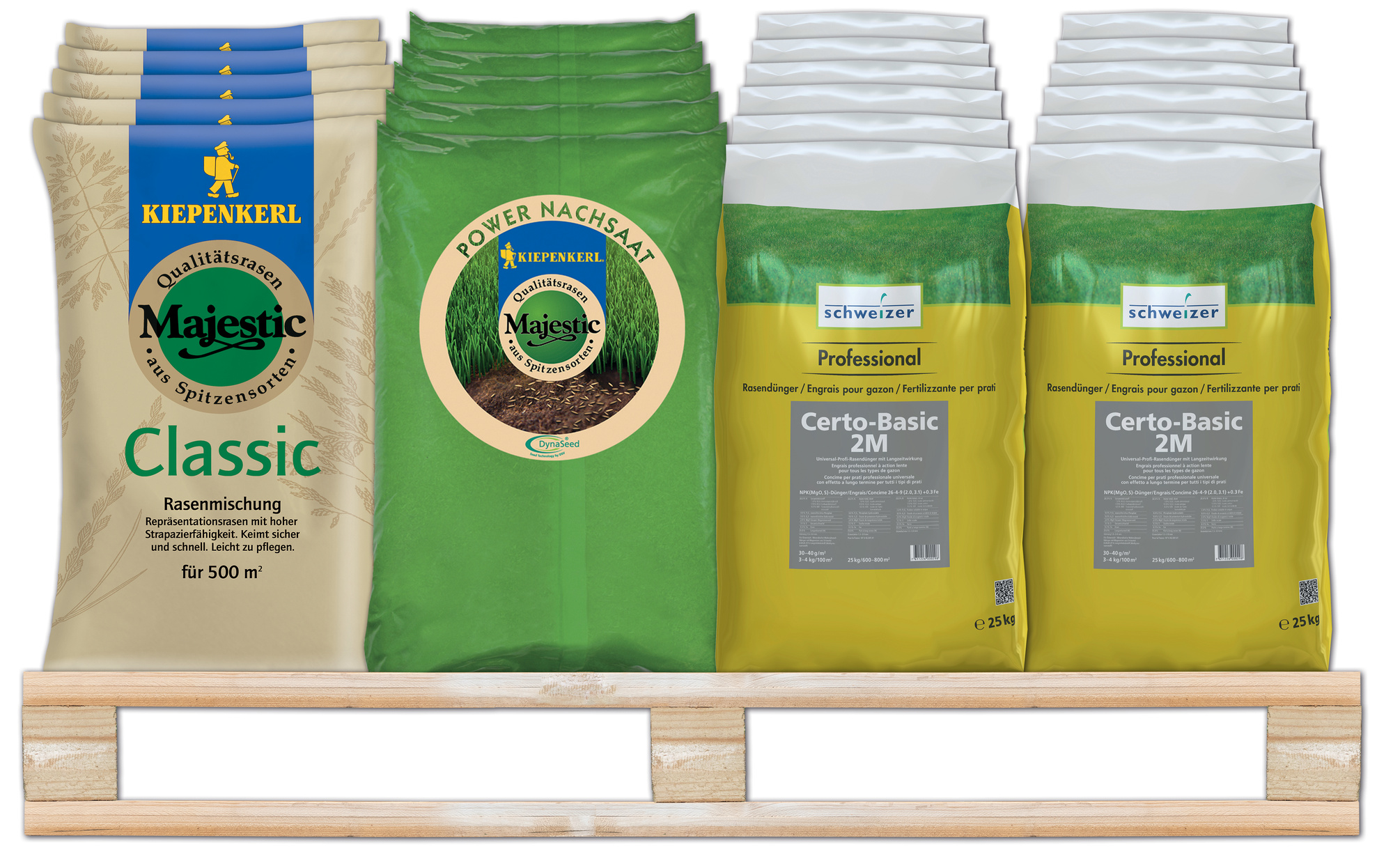 Unser einmaliges Jubiläums-Frühjahrsstartpaket*²*³ die zwei Profi-Rasenmischungen Majestic CLASSIC und POWER NACHSAAT sowie den bewährten Profi-Rasendünger Certo-Basic 2M.