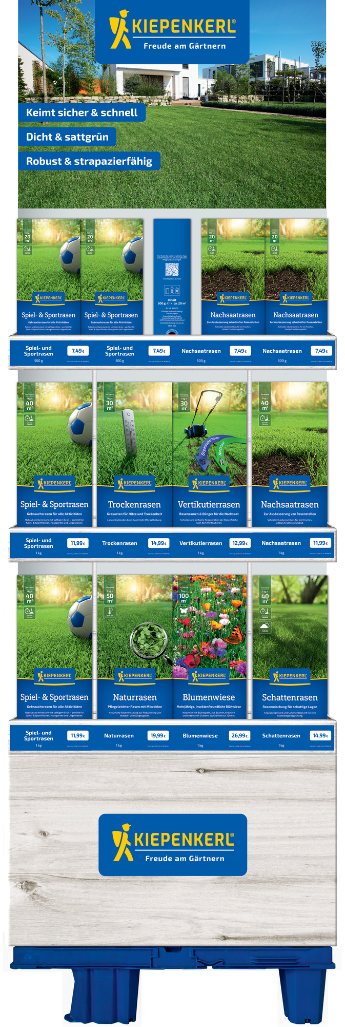 Mit diesem Sortiment erhalten sie eine breite Auswahl aus unseren hochwertigen Basisprogramm im Bereich Rasen- und Blumenwiesen. Artikel wie bspw. Sport- und Spielrasen, Nachsaatrasen und Vertikutierrasen sprechen eine breite Kundengruppe an. Die in diesem Display auf 3 reduzierten Regale und Verpackungsgrößen von max. 1 kg eignen sich besonders für einen schnellen Abverkauf.