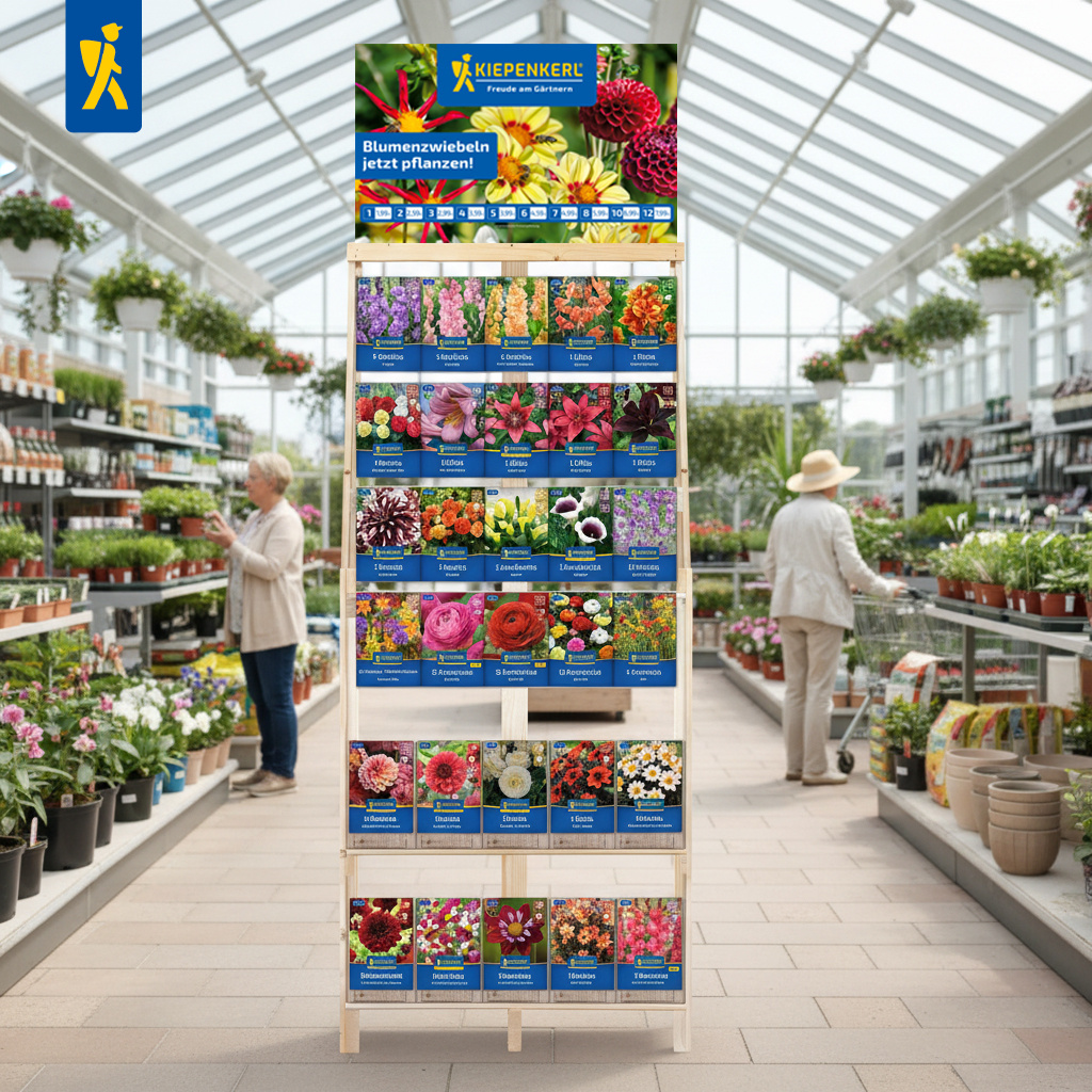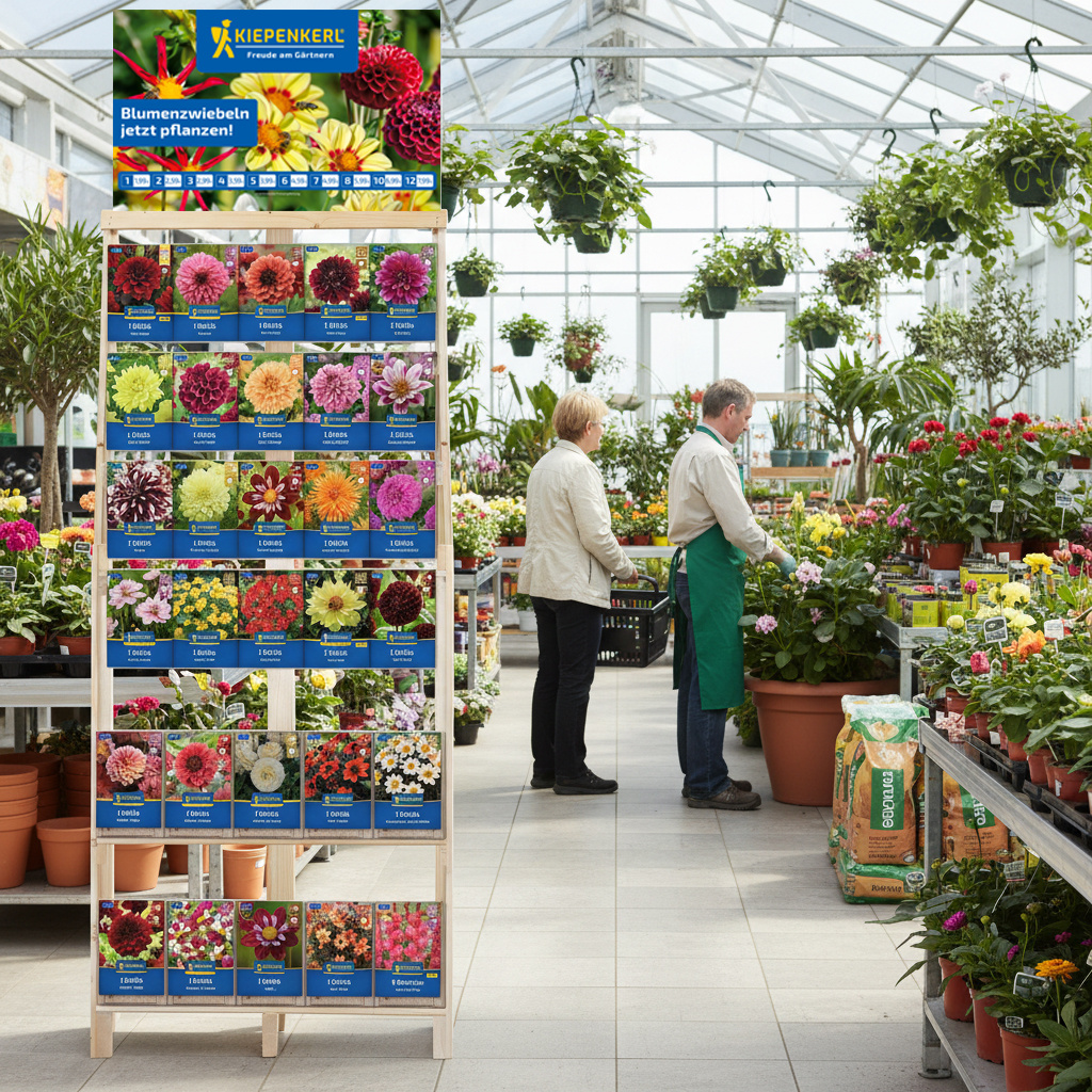 Mit dieser hochwertigen Lösung erhalten Sie ein umsatzstarkes Kleinflächenkonzept, das Neuheiten und bewährte TOP-Seller der starken Marke Kiepenkerl ideal kombiniert. So schaffen Sie eine kompakte, professionelle Präsentation der Sommer-Blumenzwiebeln, die sowohl für Fachhandel als auch für stark frequentierte Märkte bestens geeignet ist.