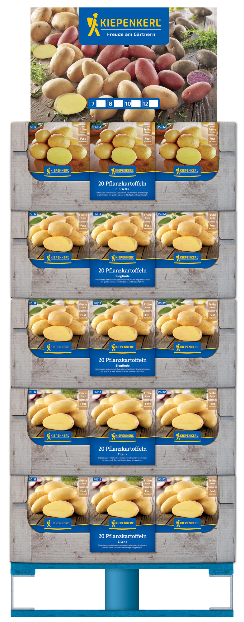 Die Qualitäts-Produkte der Marke Kiepenkerl werden in einem zweiseitigen Stapelkarton-Display optimal präsentiert. Im Fokus stehen Großpackungen, die sich besonders für größere Beete, Kleingartenanlagen oder intensive Selbstversorgung eignen. Das Display ermöglicht es, das Pflanzkartoffel-Sortiment zum Thema Selbstversorgung auf effizienter Fläche darzustellen und spricht sowohl ambitionierte Hobbygärtnerinnen und Hobbygärtner als auch semi-professionelle Anwenderinnen und Anwender an.
