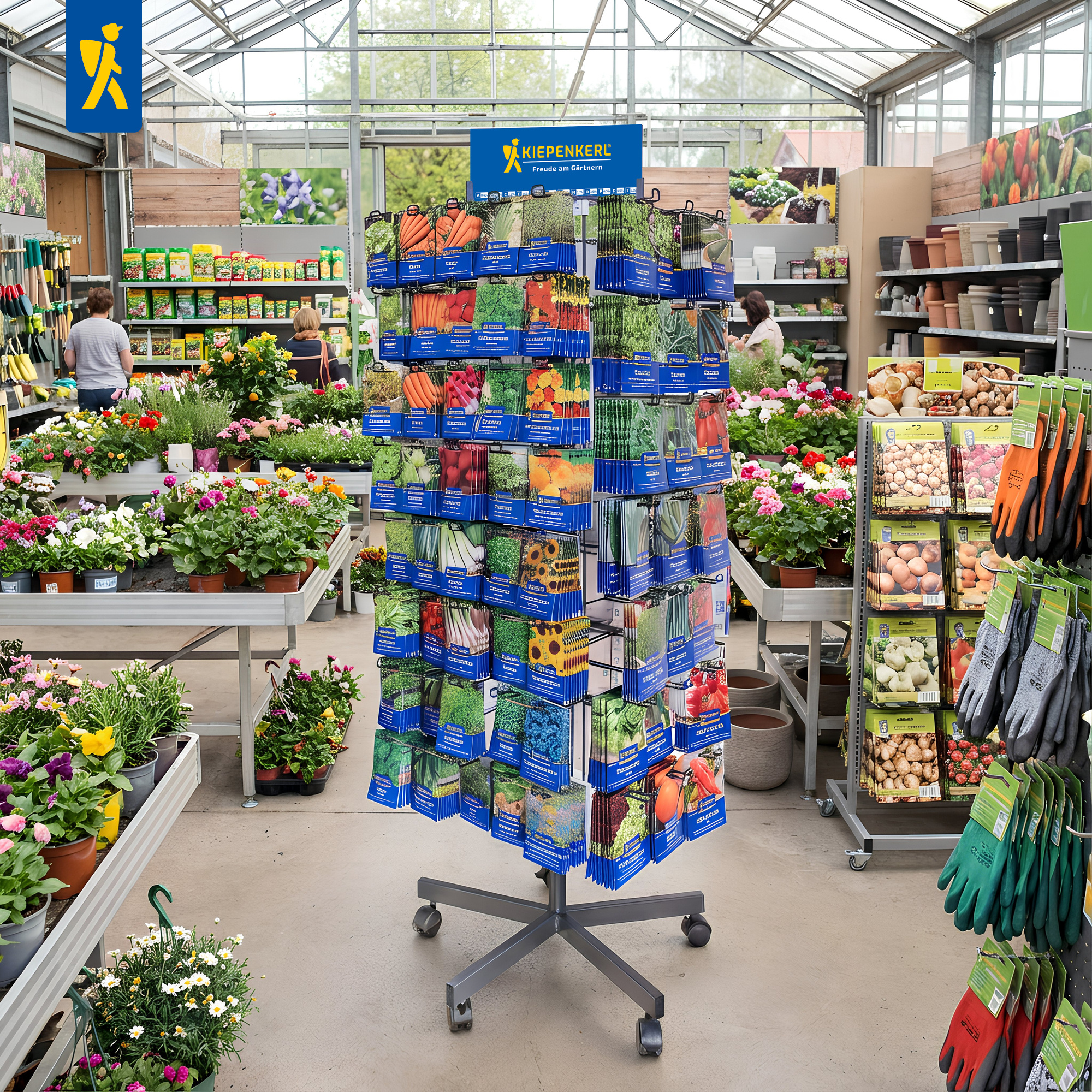 Stärken Sie Ihr Saatgutangebot mit dem 4-seitigen Kiepenkerl Drehständer und bieten Sie Ihrer Kundschaft eine professionelle, übersichtliche Auswahl an Top-Sortimenten.