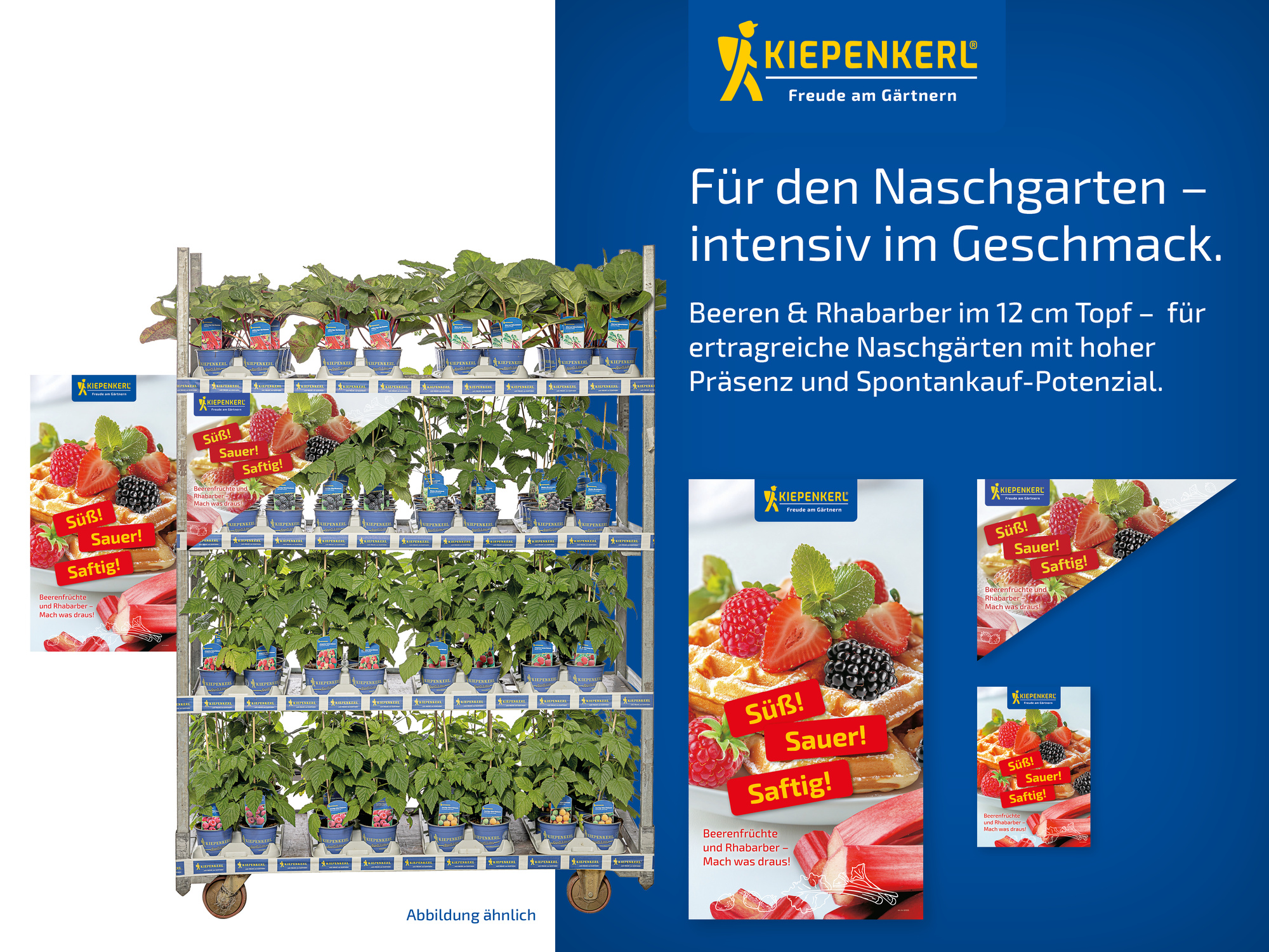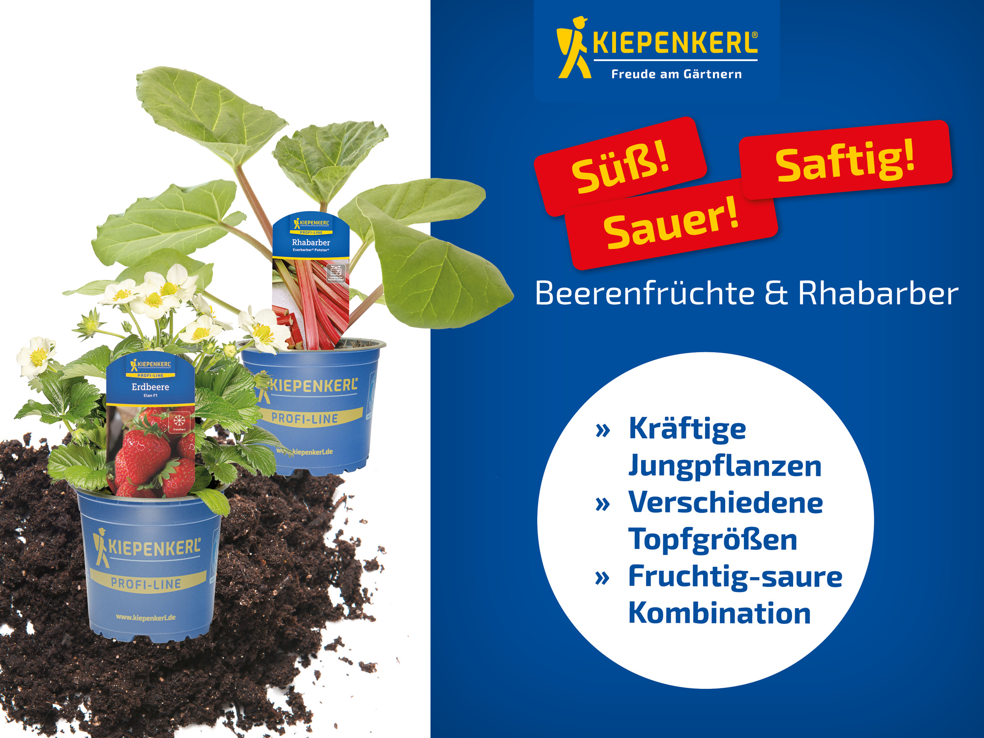 Das Sortiment Beerenfrüchte und Rhabarber bündelt das Kiepenkerl Profi-Line Beerensortiment in einer besonders verkaufsstarken Phase. Beliebte Erdbeer-Top-Seller, verschiedene Brombeeren, Himbeeren und Rhabarber im 12 cm Topf bilden eine attraktive Nasch- und Erntefläche für die ganze Familie. Die überwiegend mehrjährigen Pflanzen schaffen eine dauerhafte Bindung an den Gartenstandort und sorgen über Jahre für Erntefreude.
