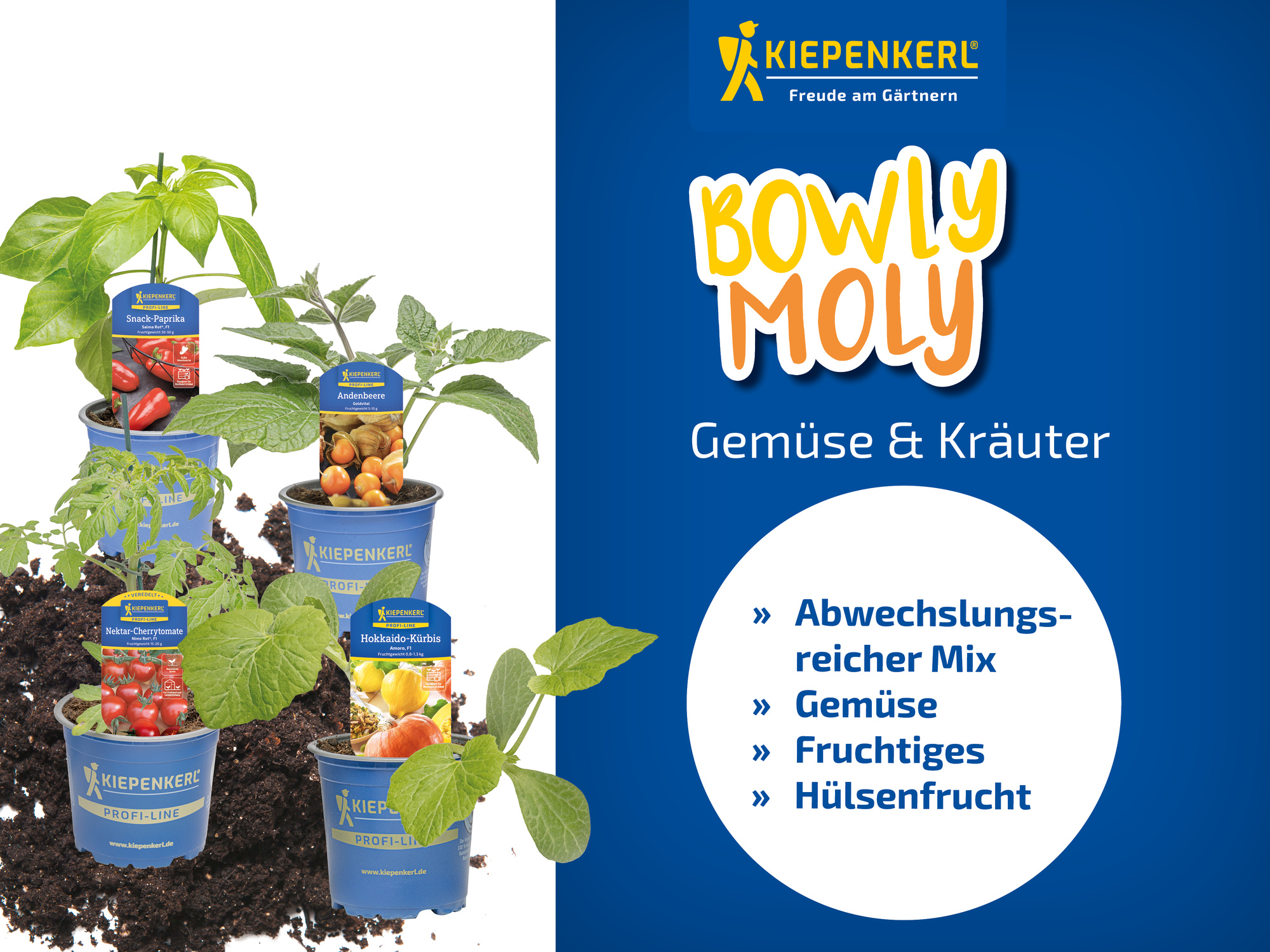 Bowly Mowly setzt bekannte Gemüse- und Kräuterpflanzen im Kontext des Trendthemas Bowl neu in Szene. Das Sortiment umfasst Sorten, die sich besonders gut für bunte, frische Schalenkreationen eignen – von knackigen Salaten über Fruchtgemüse bis hin zu aromatischen Kräutern. So entsteht ein modernes, leicht verständliches Konzept für die gesundheitsbewusste Küche.