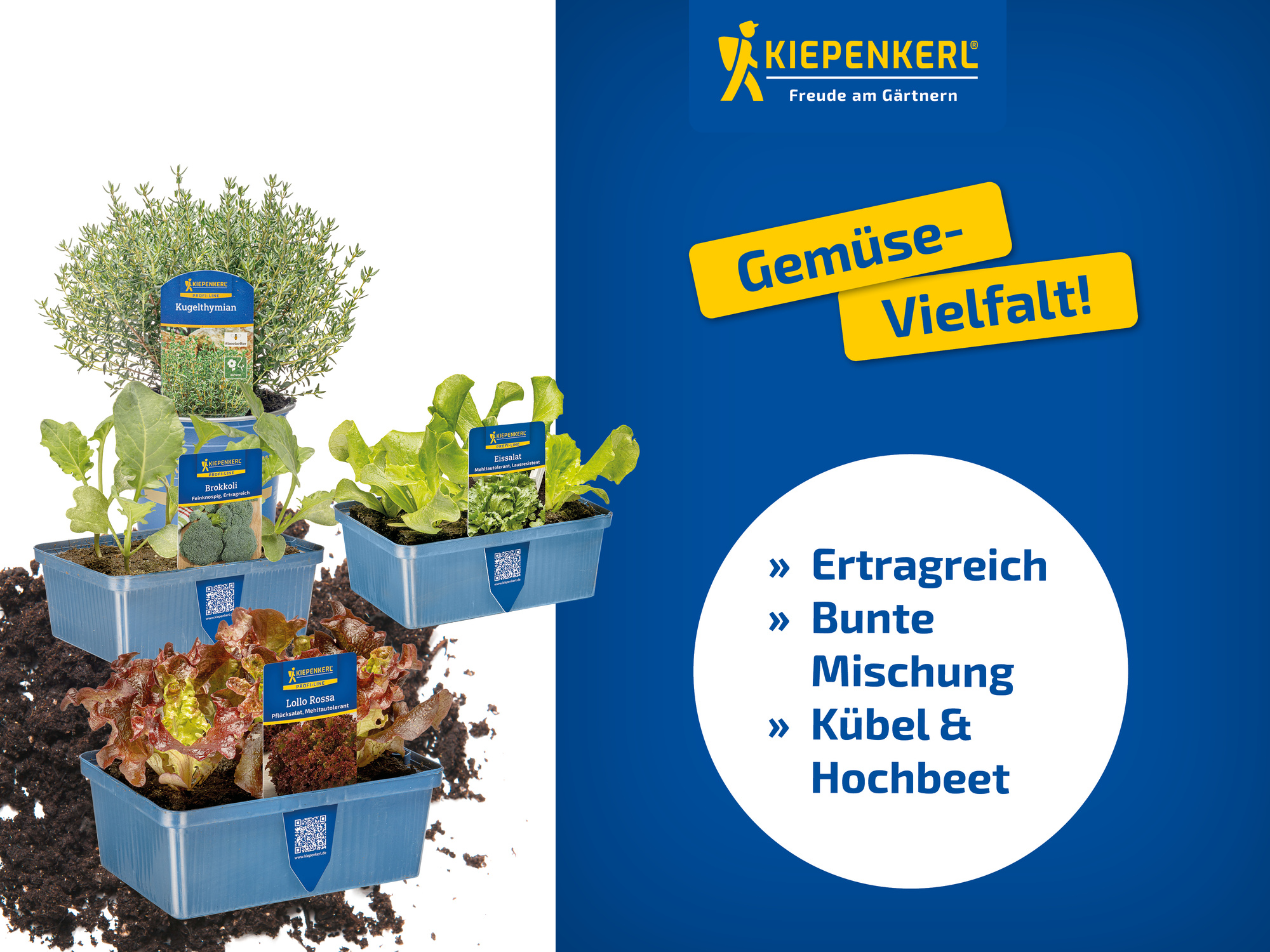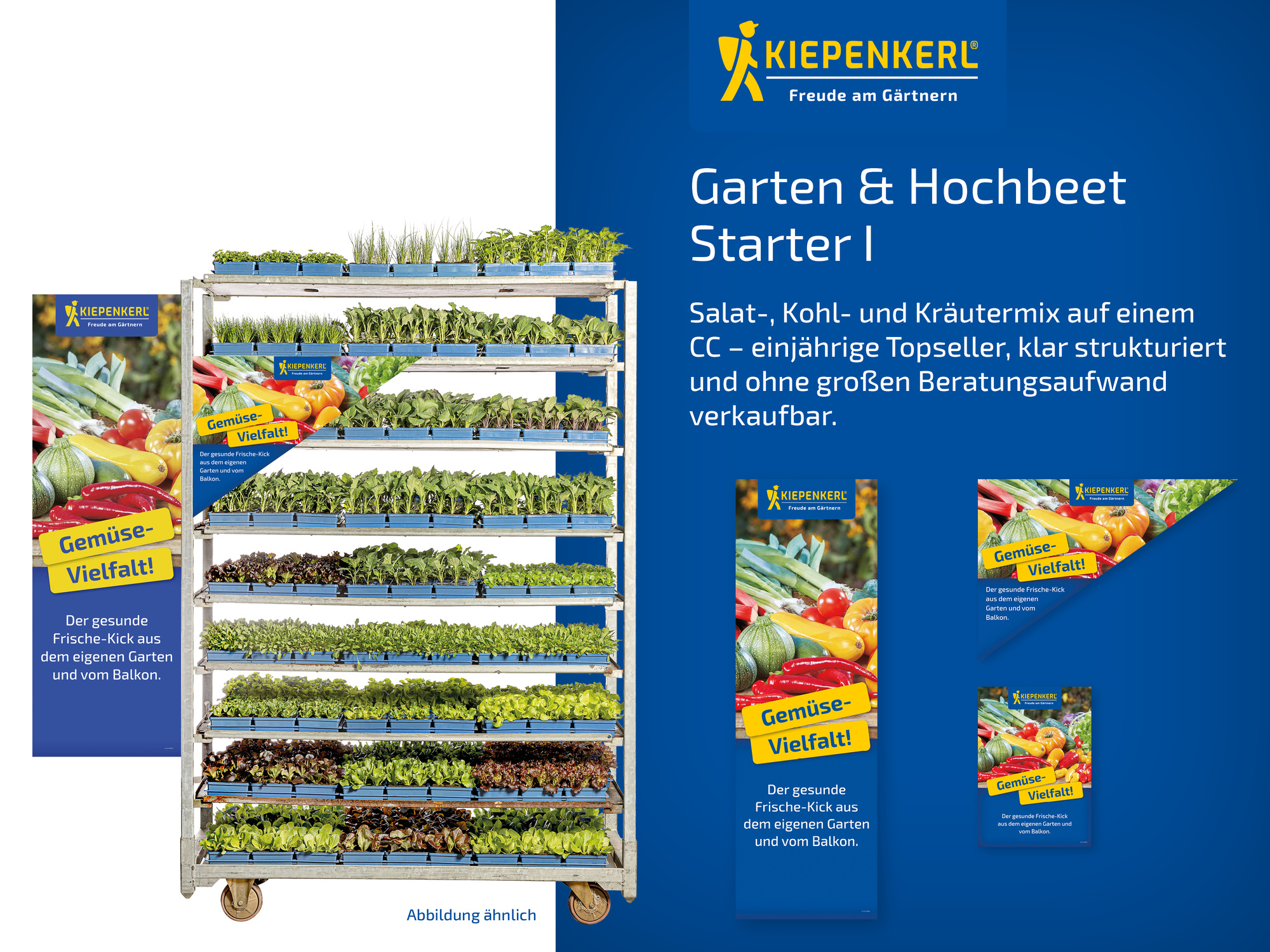 Der Garten & Hochbeet Starter I ist ein durchdachtes Einstiegs- und Aktionssortiment für den Saisonstart. Auf einem CC-Container finden sich Topseller aus den Bereichen Salat, Kohl und Kräuter in einer ausgewogenen Mischung. Dadurch entsteht eine kompakte, aber sehr attraktive Auswahl, die Endverbraucher ohne großen Beratungsaufwand abholt. Die Pflanzen eignen sich gleichermaßen für Freiland & Gewächshaus sowie Hochbeet & Kübel und decken damit ein breites Spektrum typischer Kundenwünsche ab.