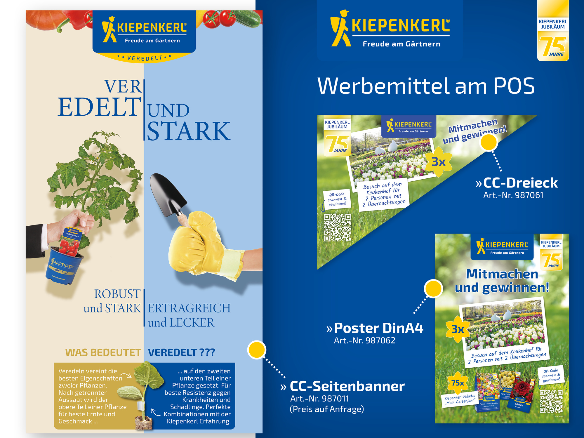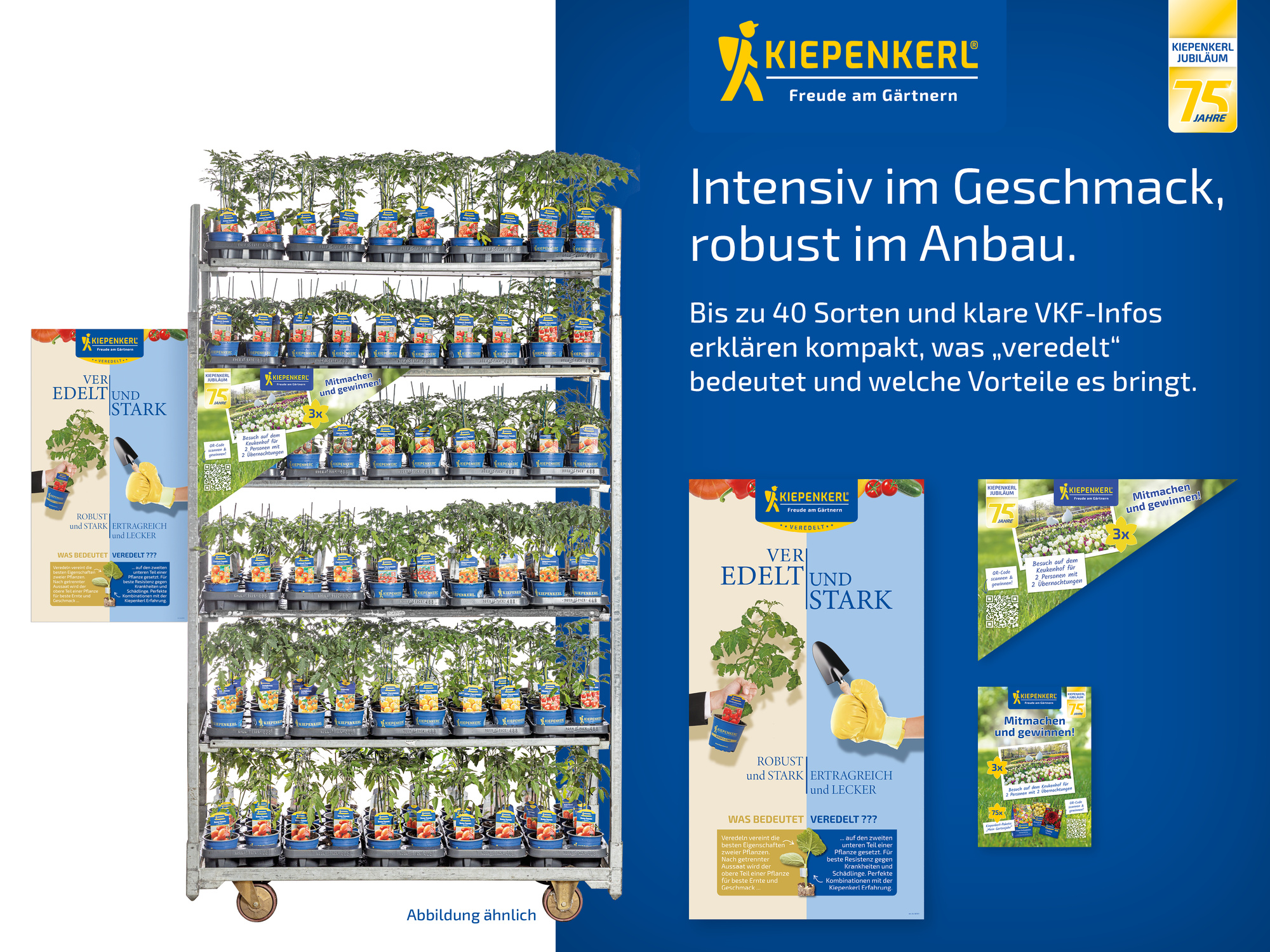 Die Pflanzen eignen sich für die Kultur in Freiland & Gewächshaus sowie in Hochbeet & Kübel. Der Lieferzeitraum KW 15–18 ist ideal, um Jubiläumsaktionen, Verkostungsangebote oder Sonderflächen im Gemüsesortiment umzusetzen und die Marke Kiepenkerl sichtbar in den Vordergrund zu stellen.