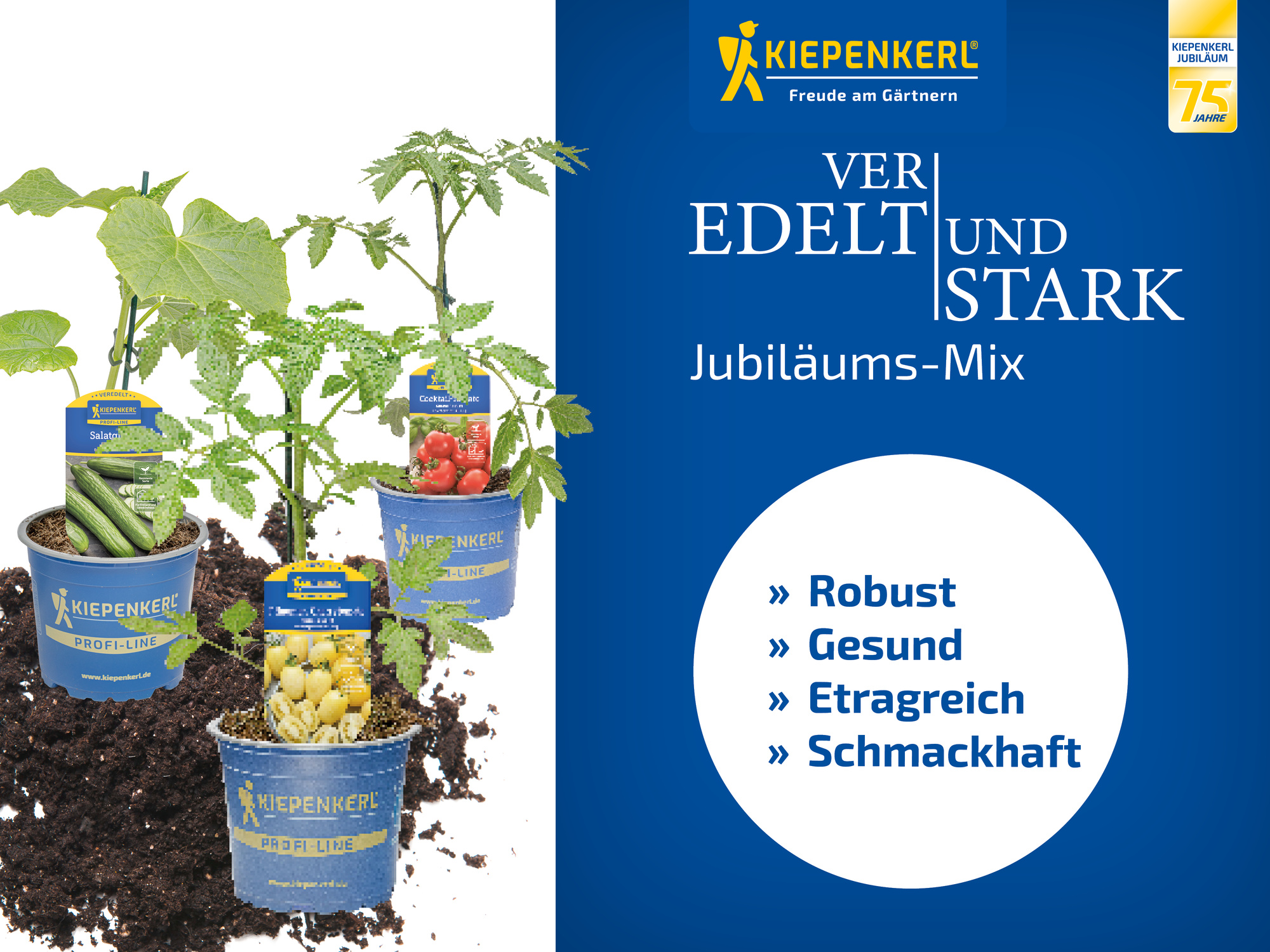 Der Veredelt & Stark Jubiläums Mix würdigt 75 Jahre Kiepenkerl mit einem sorgfältig ausgewählten Hauptsortiment veredelter Gemüsepflanzen. Im Mittelpunkt steht die besonders schmackhafte Jubiläumssorte „Moonshine“, die das hochwertige Sortiment geschmacklich und optisch abrundet. Für Fachhändler entsteht eine starke Story, die Tradition und Innovation überzeugend miteinander verbindet.