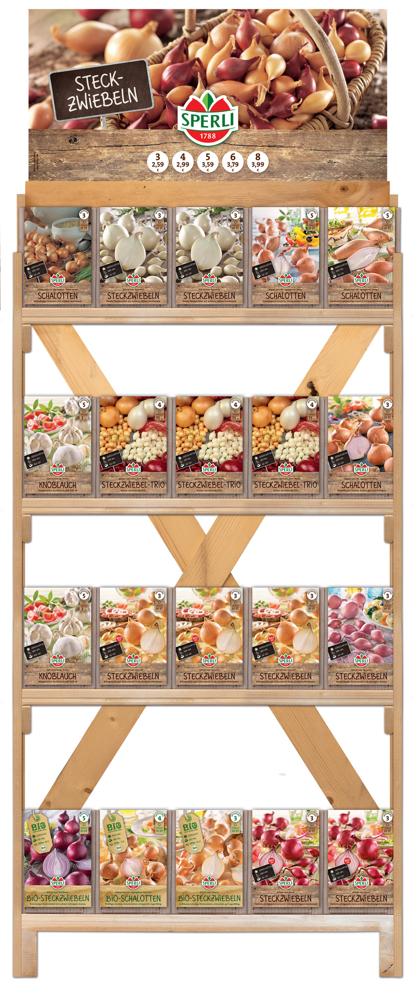 Bestellen Sie dieses SPERLI Holzregal jetzt und starten Sie mit einem attraktiven, umsatzstarken Steckzwiebel- und Schalotten-Sortiment in die Frühjahrssaison.