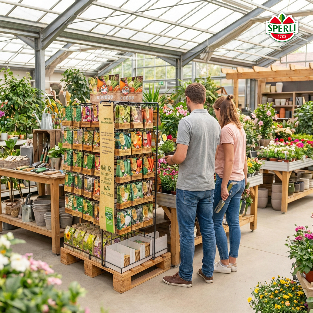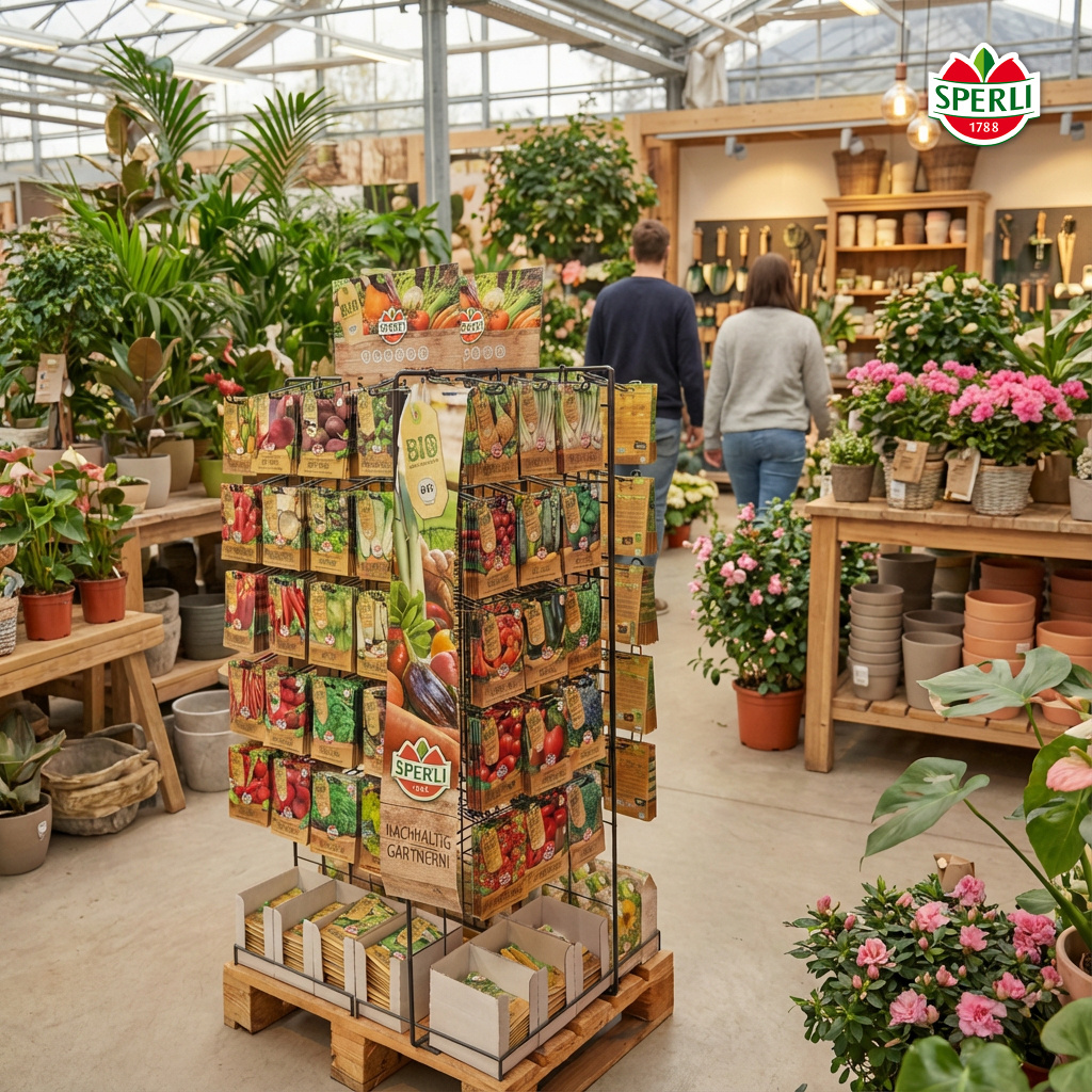 Diese vierseitige Paletteninsel bietet eine große Auswahl an SPERLI BIO-Saatgut, einschließlich Hülsenfrüchten und Bio-Gründünger. Damit stellen Sie Ihrer Kundschaft eine umfangreiche Sortimentsvielfalt im Bio-Bereich zur Verfügung – ideal für den ökologischen Anbau im Beet, Hochbeet oder Kübel.