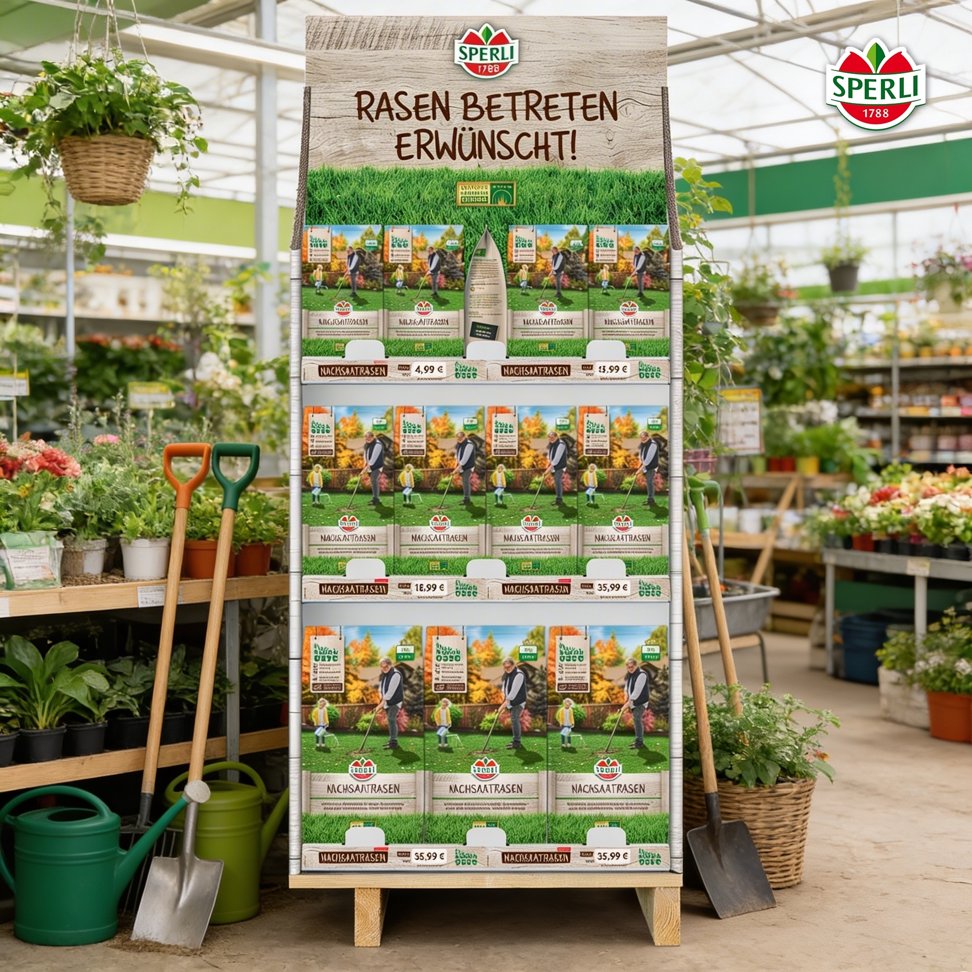 - Karton-Etagen-Display mit SPERLI Nachsaatrasen 0,25 kg sowie Nachsaatrasen mit ökologischer Saatgutumhüllung in 1 kg und 2 kg
