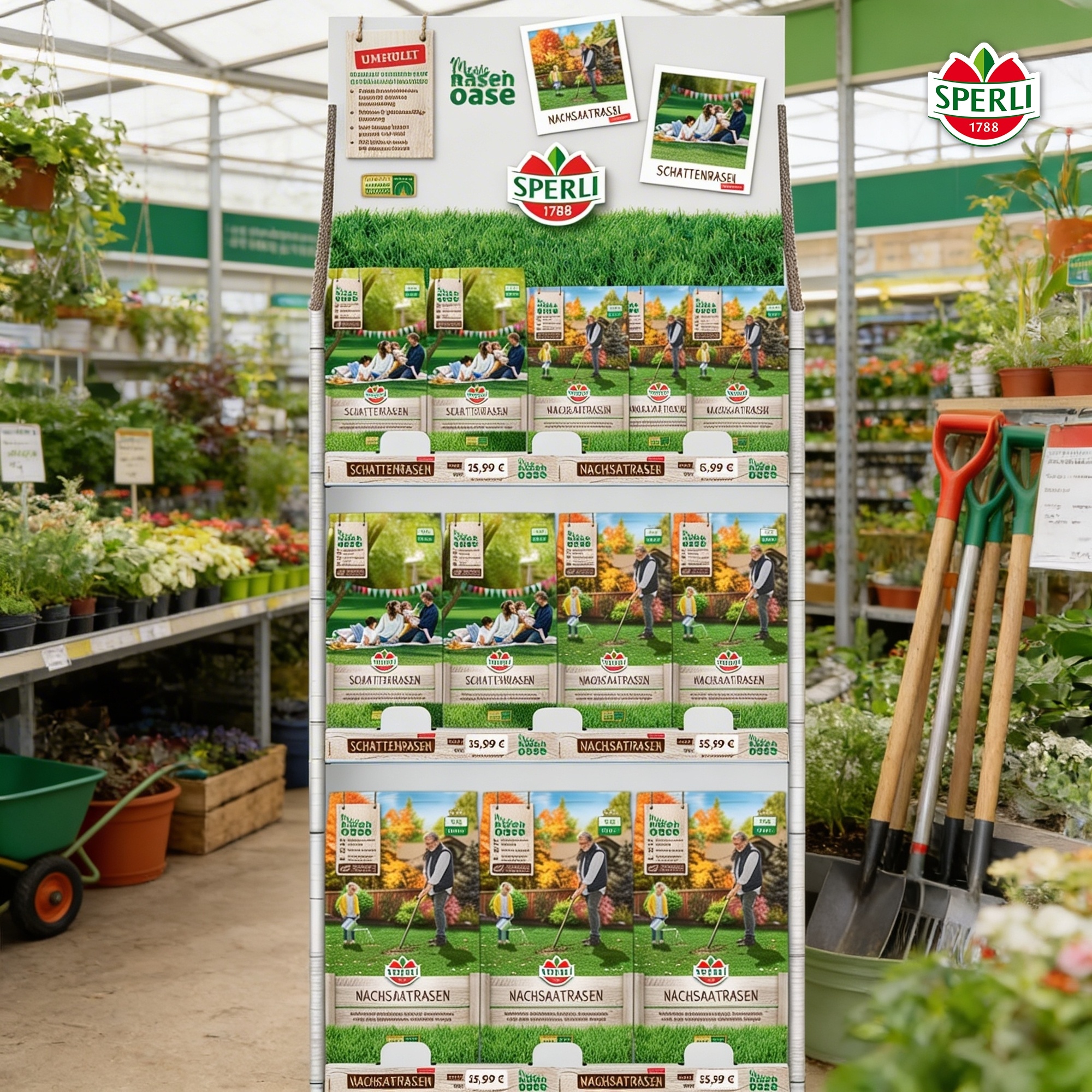 - Karton-Etagen-Display mit SPERLI Schattenrasen und SPERLI Nachsaatrasen in einer kompakten, aufmerksamkeitsstarken Präsentation