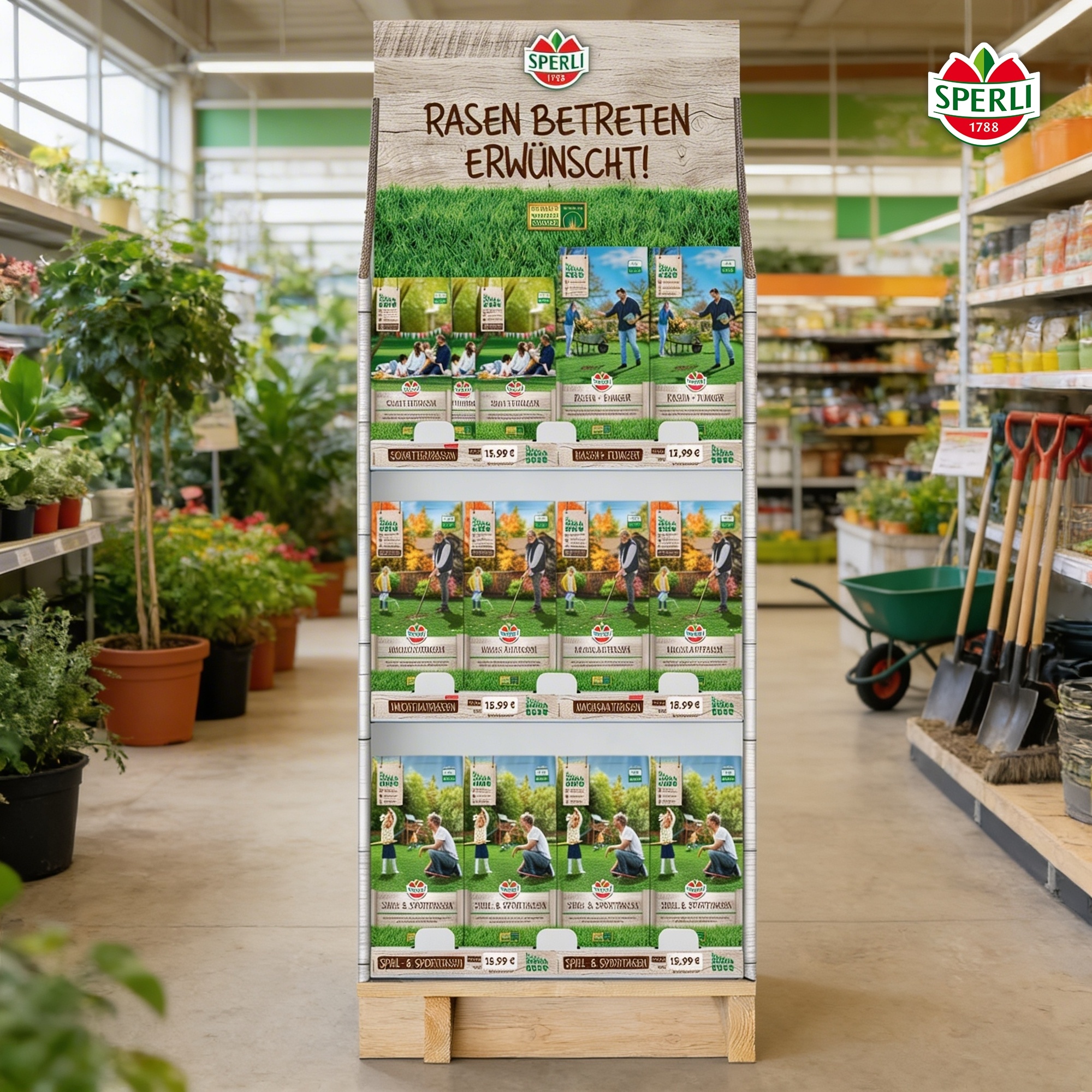 - Karton-Etagen-Display mit vier SPERLI Top-Artikeln: Spiel- und Sportrasen 1 kg (RSM 2.3), Rasen + Dünger, Schattenrasen und Nachsaatrasen