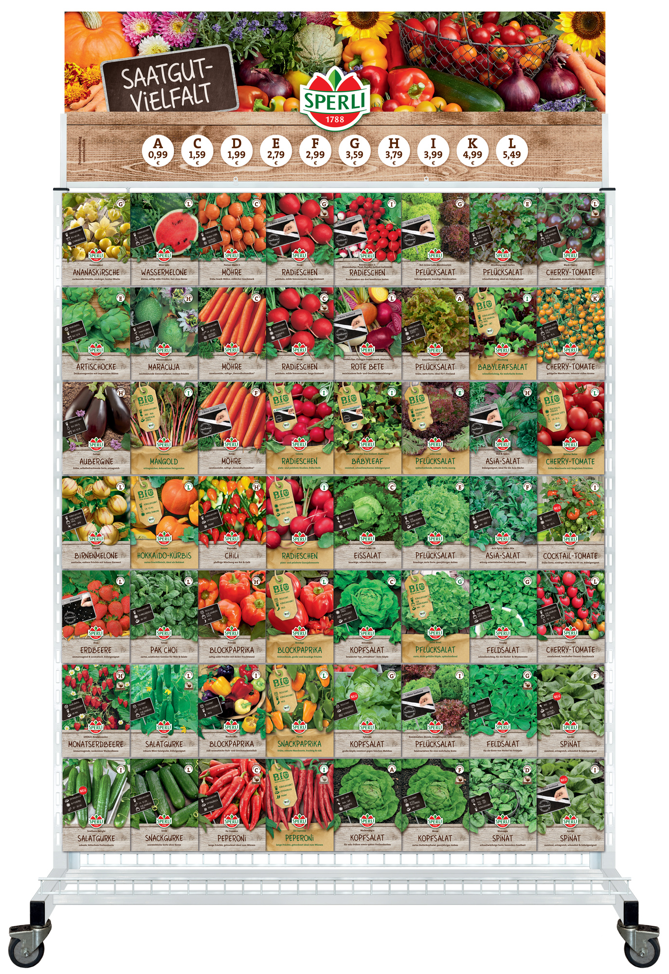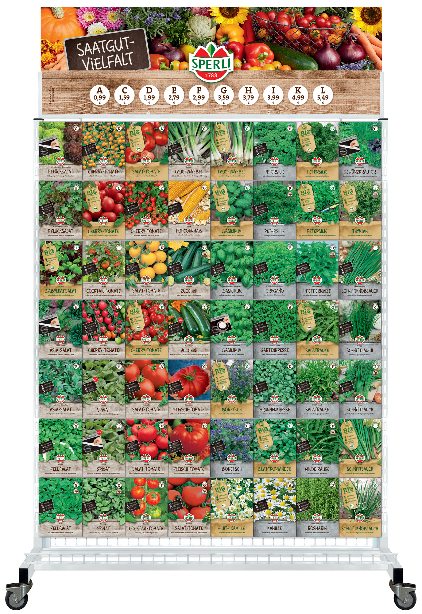 - Zweiseitiger Rollständer mit exklusivem Sortimentsfokus auf hochbeetgeeignete Gemüse- und Kräutersorten