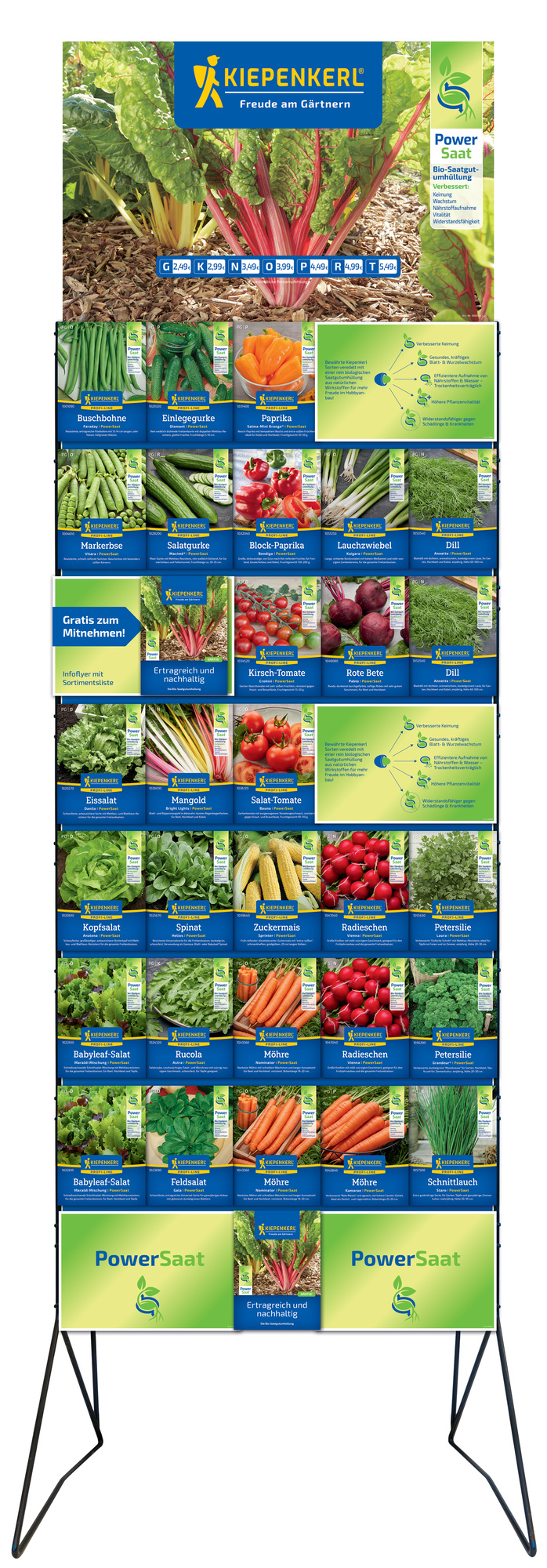 Mit dem einseitig bestückten Themenständer „PowerSaat“ präsentiert die Premium Marke Kiepenkerl innovative Saatgutqualität auf kompakter Fläche. Auf 40 Haken werden 25 ausgewählte Gemüse und Kräutersorten in der leistungsstarken PowerSaat Ausstattung inklusive Verbraucherinformation präsentiert – ideal, um Ihrer Kundschaft moderne, ertragsstarke Saatgutlösungen anzubieten.