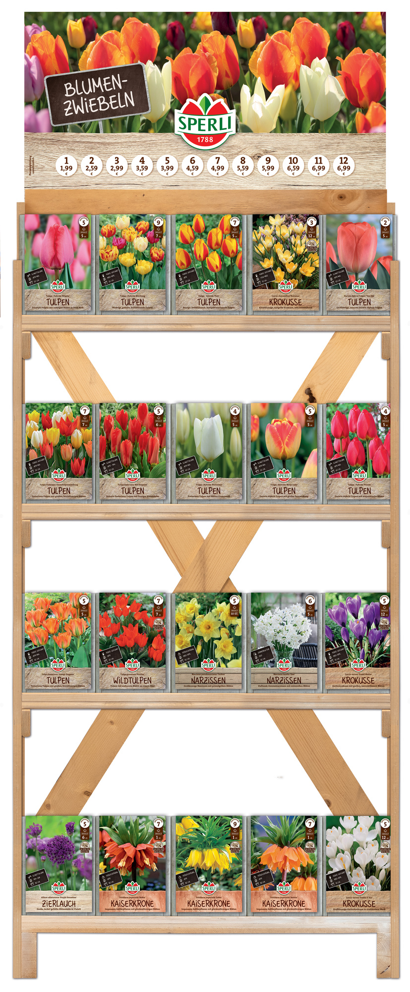 Starte mit SPERLI Blumenzwiebeln früh in den Herbst und sichere Dir deine ersten Umsätze mit unserem Vorabprogramm in Kalenderwoche 31. Das einseitige Holzregal mit 4 Lagen enthält die ersten Herbst-Blumenzwiebeln unserer Marke SPERLI zum Start in die zweite Gartensaison. Nachhaltig wiederverwendbar!Dieses Set enthält keine Dubletten zum Set 'Neuheiten & Topseller', Art.Nr.: 00058239-00-00. Somit lässt sich das Blumenzwiebel-Sortiment, aufeinander abgestimmt, sinnvoll erweitern.
