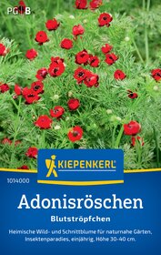 Das Adonisröschen ist eine seltene, heimische Wildpflanze, die durch ihre feuerroten Blüten mit schwarzer Mitte besticht. Diese einjährige Staude erreicht eine Höhe von 30–40 cm und ist ein wahrer Magnet für Insekten, wodurch sie einen wertvollen Beitrag zur Biodiversität in naturnahen Gärten leistet. Die Pflanze eignet sich hervorragend sowohl als Schmuckstück im Beet als auch für den Schnitt, um Ihre Blumenarrangements zu bereichern. Beachten Sie jedoch, dass der Verzehr des Adonisröschens zu gesundheitlichen Komplikationen führen kann. Staunen Sie über die Schönheit dieser Wildblume und schaffen Sie Lebensräume für Insekten durch den Anbau des Adonisröschens! Entdecken Sie die wunderbare Verbindung zwischen Natur, Garten und den kleinen Geschöpfen, die sich an dieser prachtvollen Blüte erfreuen. Fügen Sie das Adonisröschen in Ihren Garten ein für eine bunte Pracht und ganzheitliches Gärtnern!| Kurzbezeichnung : | Adonisröschen Blutströpfchen |