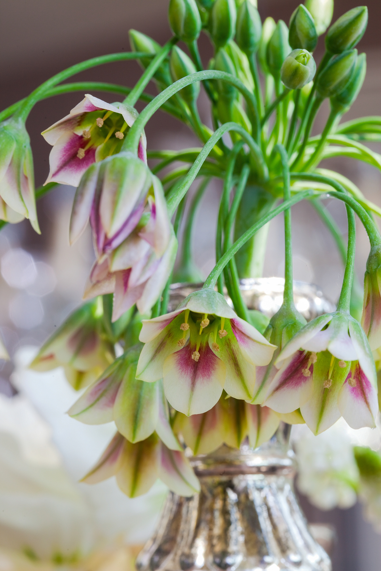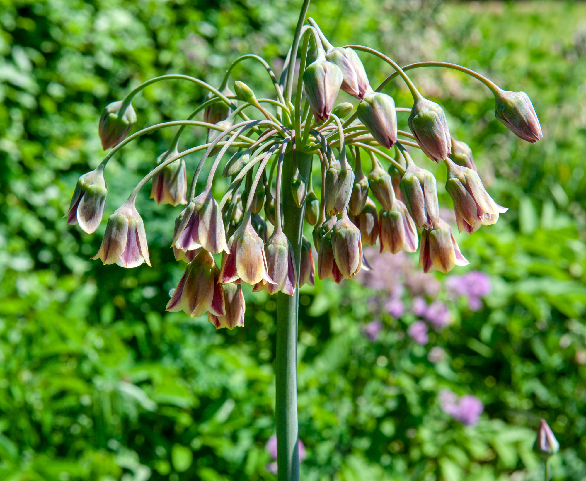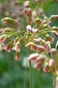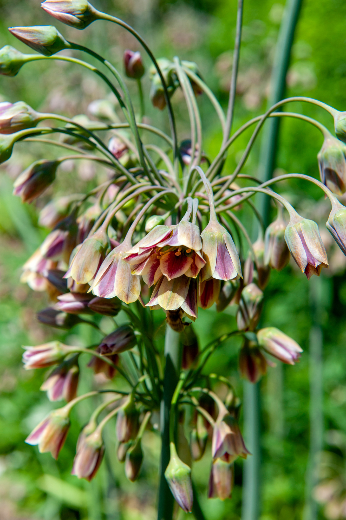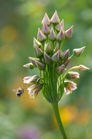 Nectaroscordum siculum, auch als Sizilianischer Honiglauch, Bienenlauch oder Bulgarischer Lauch bekannt, ist eine mehrjährige und frostharte Zwiebelpflanze. Ursprünglich in Südeuropa, insbesondere in den Regionen rund um das Mittelmeer, beheimatet, hat sich diese Art aufgrund ihrer auffälligen Blüten und ihres attraktiven Erscheinungsbildes zu einer beliebten Zierpflanze entwickelt.Dieser Zierlauch zeichnet sich durch seine charakteristischen Blüten aus, die auf circa 100 Zentimeter hohen Stielen, in einer dichten Traube angeordnet sind. Jede glockenförmige Blüte zeichnet sich durch mehrere Farbnuancen aus, die sich von weinrot, bräunlich, creme bis hin zu mattgrün, purpurrot und karamellbraun mit dem Aufblühen verändern.
