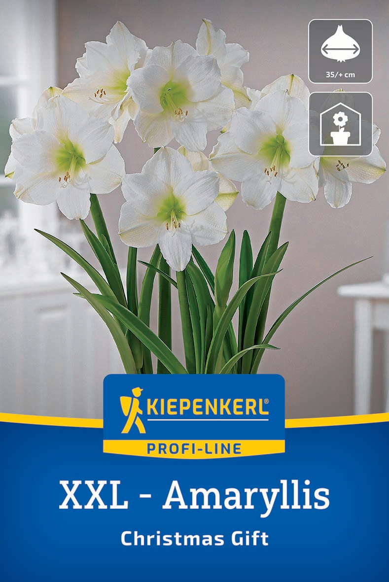 Die Amaryllis `Christmas Gift` von Kiepenkerl wird nur als hochwertige XXL-Blumenzwiebel angeboten und überzeugt mit besonders kräftiger Triebkraft. Daraus entwickeln sich große, haltbare Blüten in edlem Cremeweiß, leicht gewellt und mit einem gelb-grünen Blütenhals. Von Dezember bis Februar steht diese Amaryllis in voller Pracht und sorgt für eine stimmungsvolle Winterblüte auf der Fensterbank.