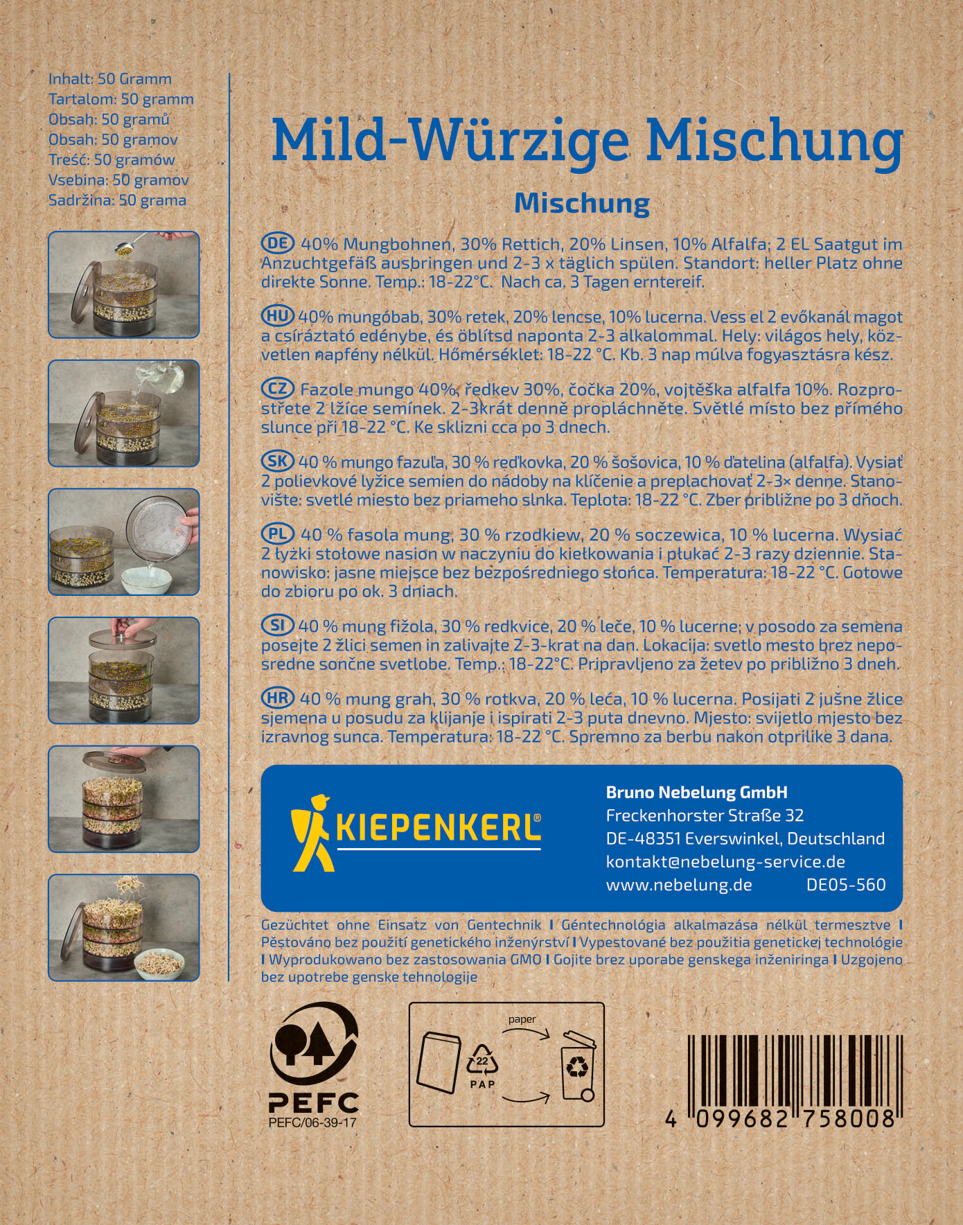 Mild-würziger Geschmack. Mischungszutaten: 70 % Mungbohnen, 30 % Rettich. Anzucht in der Kiepenkerl Sprossenbox: Verteilen Sie je 1 EL Saatgut in eine Schale mit dem Ablaufventil. Nun Wasser hineingeben und ablaufen lassen. Den Deckel aufsetzen und die Sprossenbox an einen hellen Platz ohne direkte Sonne stellen. 2- bis 3-Mal täglich bis zur Ernte spülen. Optimale Temperatur: 18 - 21 °C. Verzehrfertig in 3 bis 5 Tagen.| Kurzbezeichnung : | BIO Keimsprossen Mild-würzige Mischung |