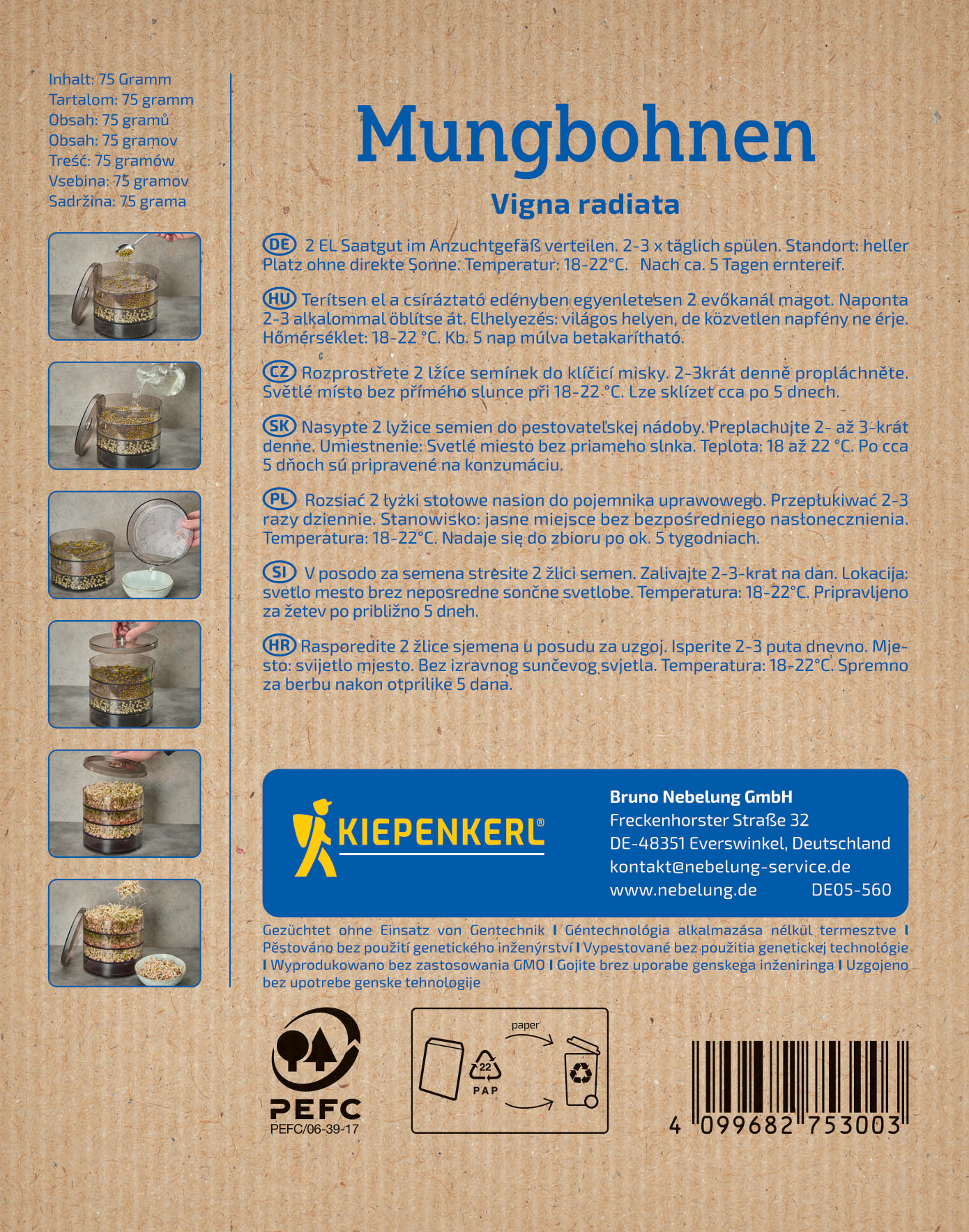 Mungbohnen haben einen frischen, leicht süßlichen, nussartigen Geschmack. Diese Keimlinge werden speziell in China gezüchtet und traten von dort ihren Siegeszug rund um die Welt an. Mungbohnen können roh verzehrt werden und ergänzen süße und salzige Speisen hervorragend. 2- bis 3-Mal täglich bis zur Ernte spülen. Verzehrfertig in 3 bis 5 Tagen.| Kurzbezeichnung : | BIO Keimsprossen Mungbohnen |