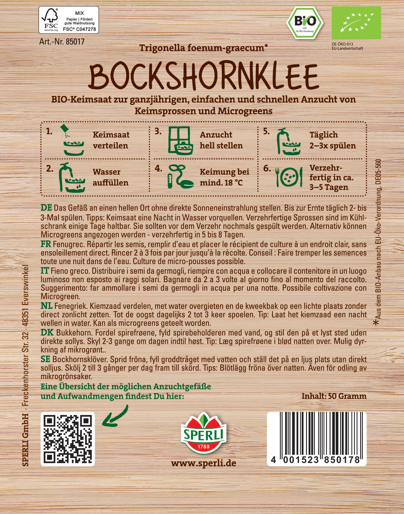 Bockshornklee ist sehr begehrt, besonders ein leckeres Käsebrot am Abend werten die Sprossen mit ihrem außergewöhnlichen Geschmack auf. Sie schmecken leicht bitter und würzig. Wir empfehlen Dir die Kultur in der SPERLI Sprossenbox oder in SPERLI's Grow Kits. Bereits nach 3-5 Tagen sind die Keimsprossen erntereif.| Kurzbezeichnung : | BIO Keimsprossen-Saat Bockshornklee |