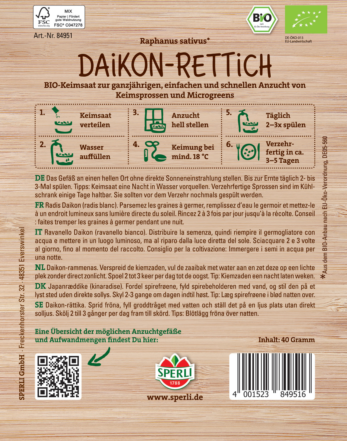 Die Sprossen des Daikon-Rettichs sind intensiv im Geschmack. Die leichte Schärfe der Sprossen peppt zahlreiche Gerichte auf. Wir empfehlen Dir die Kultur in der SPERLI Sprossenbox oder in SPERLI's Grow Kits. Bereits nach 3-5 Tagen sind die Keimsprossen erntereif.| Kurzbezeichnung : | BIO Keimsprossen-Saat Daikon-Rettich |