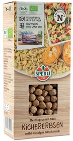 Kichererbsen mit ihrem mild-nussigen Geschmack sind sehr beliebt als Einlage in Suppen oder Eintöpfen. Sie können als Gemüsebeilage oder blanchiert in Salaten serviert werden. Das Kochen, Rösten oder Fritieren der Sprossen ist möglich. Wir empfehlen Dir die Kultur in der SPERLI Sprossenbox. Bereits nach 3-5 Tagen sind die Sprossen erntereif. Anwendung: Das Gefäß an einen hellen Ort ohne direkte Sonneneinstrahlung stellen. Bis zur Ernte täglich 2- bis 3-Mal spülen. Tipps: Keimsaat eine Nacht in Wasser vorquellen. Verzehrfertige Sprossen sind im Kühlschrank einige Tage haltbar. Sie sollten vor dem Verzehr nochmals gespült werden.| Kurzbezeichnung : | BIO Keimsprossen-Saat Kichererbse |