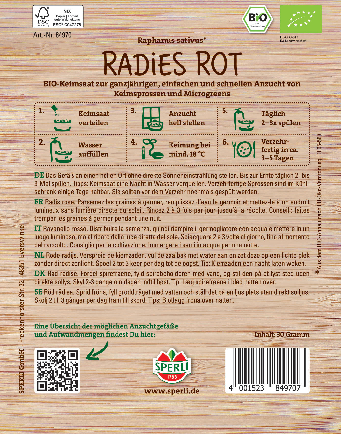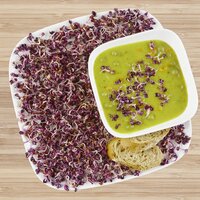 Radies-Sprossen kannst Du schon nach wenigen Tagen ernten. Ihr kräftig-würziger, teils leicht scharfer Geschmack rundet viele Gerichte ab. Wir empfehlen Dir die Kultur in der SPERLI Sprossenbox oder in SPERLI's Grow Kits. Bereits nach 3-5 Tagen sind die Keimsprossen erntereif.| Kurzbezeichnung : | BIO Keimsprossen-Saat Radies rot |