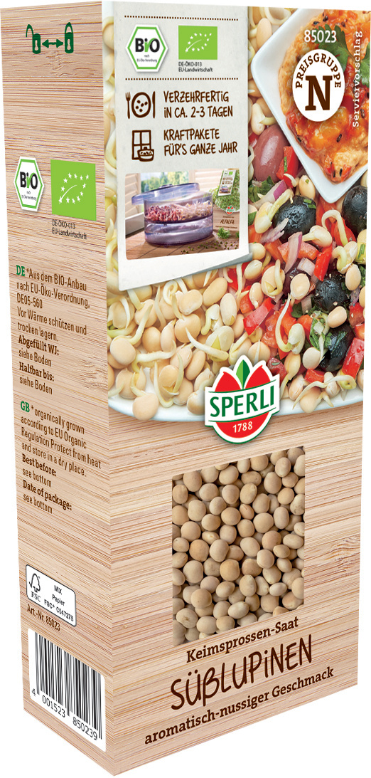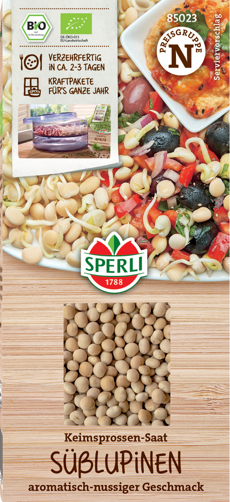 BIO-Keimsaat zur ganzjährigen, einfachen und schnellen Anzucht von Keimsprossen. Das Gefäß an einen hellen Ort ohne direkte Sonneneinstrahlung stellen. Bis zur Ernte täglich 2- bis 3-Mal spülen. Tipps: Keimsaat eine Nacht in Wasser vorquellen. Verzehrfertige Sprossen sind im Kühlschrank einige Tage haltbar. Sie sollten vor dem Verzehr nochmals gespült werden.| Kurzbezeichnung : | BIO Keimsprossen Süßlupine |