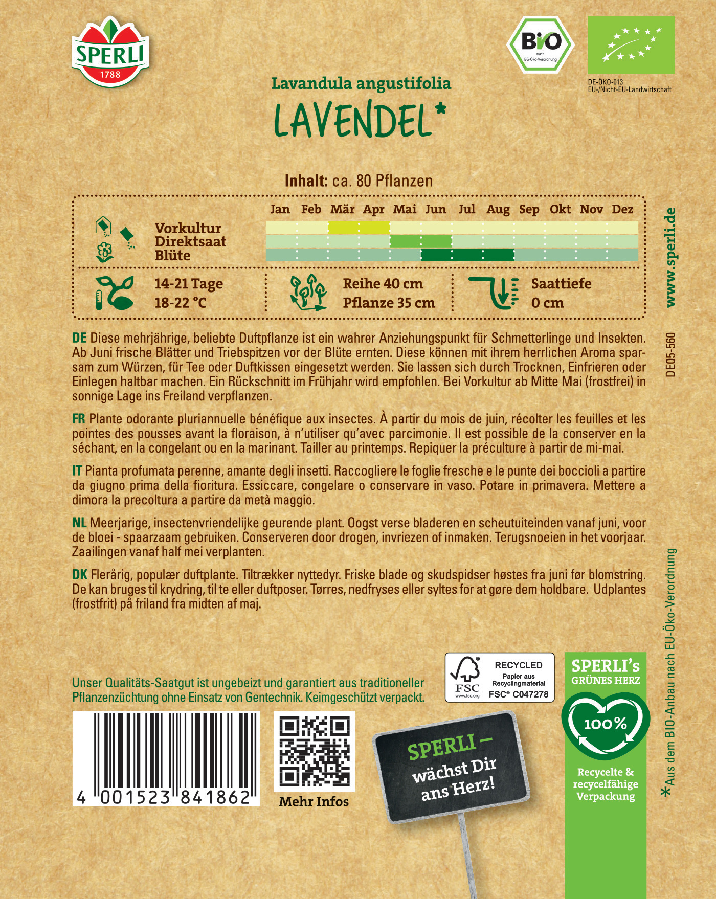 Diese mehrjährige, beliebte Duftpflanze ist ein wahrer Anziehungspunkt für Schmetterlinge und Insekten. Ab Juni frische Blätter und Triebspitzen vor der Blüte ernten. Diese können mit ihrem herrlichen Aroma sparsam zum Würzen, für Tee oder Duftkissen eingesetzt werden. Sie lassen sich durch Trocknen, Einfrieren oder Einlegen haltbar machen. Ein Rückschnitt im Frühjahr wird empfohlen. Bei Vorkultur ab Mitte Mai (frostfrei) in sonnige Lage ins Freiland verpflanzen.| Kurzbezeichnung : | BIO Lavendel |