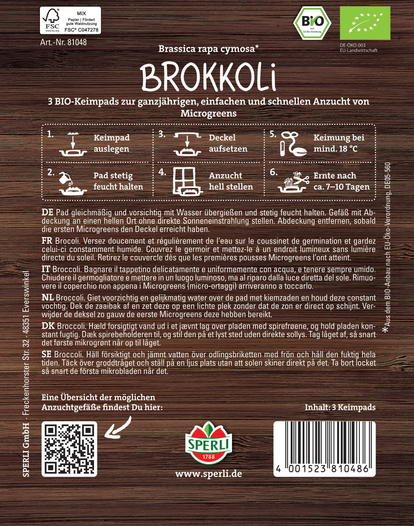 Brokkoli-Sprossen sind in den letzten Jahren sehr beliebt geworden. Ihr fein-würziger Geschmack schmeichelt dem Gaumen und erinnert wenig an ausgewachsenen Brokkoli. Die Keimpads erleichtern die ganzjährige und schnelle Anzucht der Microgreens. Wir empfehlen Dir die Kultur in der SPERLI Microgreen Box und Microgreen Duo-Box. Bereits nach 7-10 Tagen sind die Microgreens erntereif.| Kurzbezeichnung : | BIO Microgreen-Pads Brokkoli |