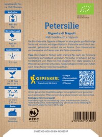 Die BIO-Petersilie 'Gigante di Napoli' ist eine glatte, großblättrige Sorte mit intensiv würzigen Blättern. Sie ist ideal, um frisch verwendet zu werden, denn gefriergetrocknete Petersilie verliert an Aroma. Für die Ernte können die Blätter bei Bedarf portionsweise eingefroren werden. Diese aromatische Kräuterpflanze ist eine wertvolle Ergänzung für jede Küche! Die geschmackliche Vielfalt und die einfache Pflege dieser Petersilienart machen sie zu einem Must-have für jeden Haushaltsgarten. Verwenden Sie die Blätter zum Verfeinern von Soßen, in Suppen oder als Garnitur in Salaten, um die Frische und das Aroma Ihrer Gerichte auf ein neues Level zu heben. Die Petersilie bringt Farbe und Genuss in Ihre Mahlzeiten. Erleben Sie die Vielseitigkeit der BIO-Petersilie 'Gigante di Napoli'!| Kurzbezeichnung : | BIO Petersilie Gigante di Napoli |