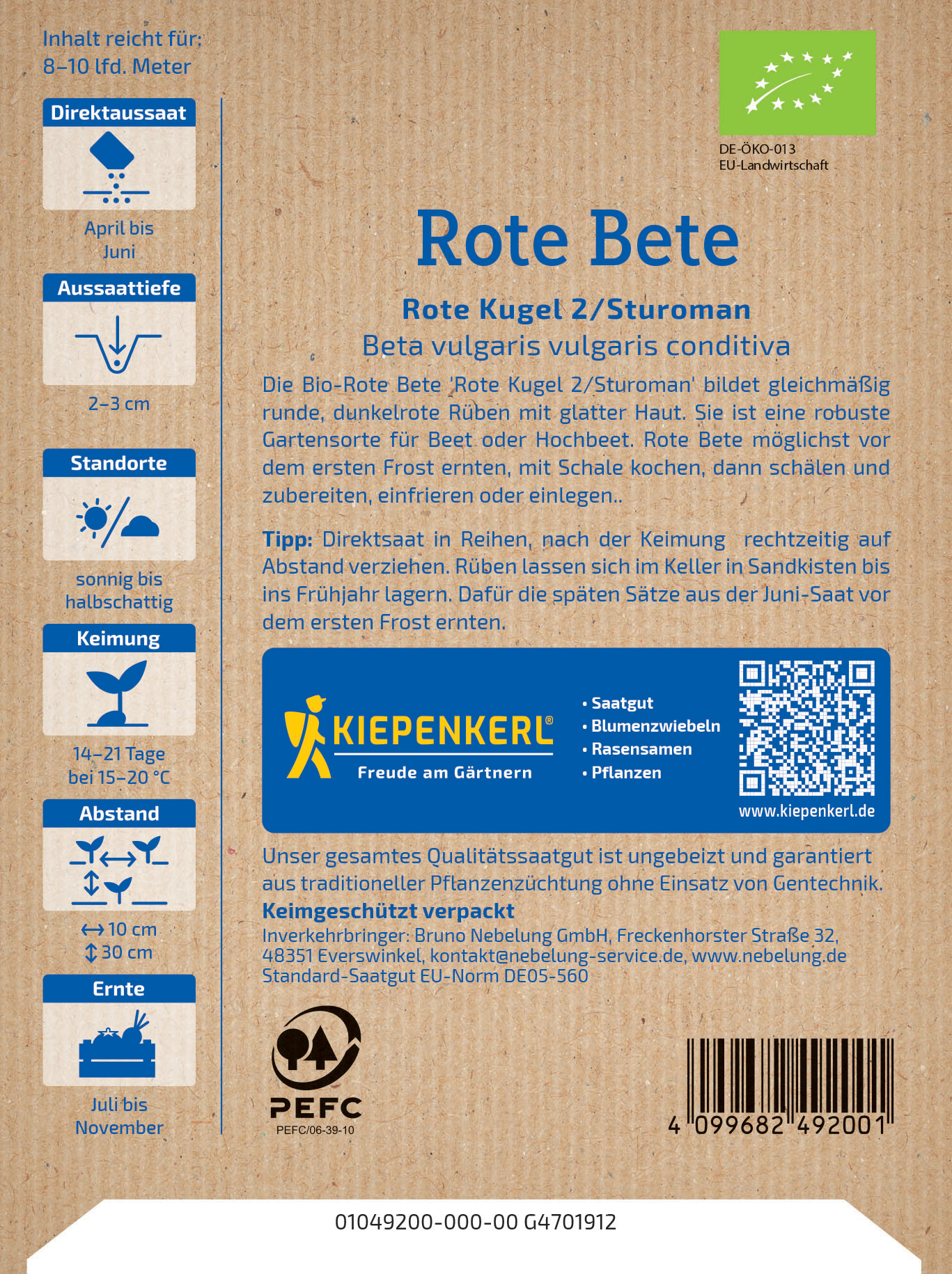 Die BIO-Rote Bete 'Rote Kugel 2/Sturoman' überzeugt mit ihren gleichmäßig runden Formen und einer dunkelroten, glatten Haut. Diese robuste Gartensorte ist sowohl für das Beet als auch für Hochbeete geeignet und zeichnet sich durch eine hervorragende Lagerfähigkeit aus. Nach der Ernte kann sie problemlos in verschiedenen Gerichten verwendet werden, sei es gekocht, gebacken oder frisch. Ihre Vielseitigkeit wird Sie zudem dazu inspirieren, immer wieder neue Rezepte auszuprobieren. Mit der BIO-Rote Bete tragen Sie nicht nur zur Umwelt bei, sondern genießen zugleich die Vorteile eines gesunden Gemüses aus eigenem Anbau. Lassen Sie sich die Freude am Gärtnern und Kochen nicht entgehen! Erleben Sie den köstlichen Genuss der BIO-Rote Bete 'Rote Kugel 2/Sturoman' für Ihre Küche!| Kurzbezeichnung : | BIO Rote Bete Rote Kugel 2/Sturoman |