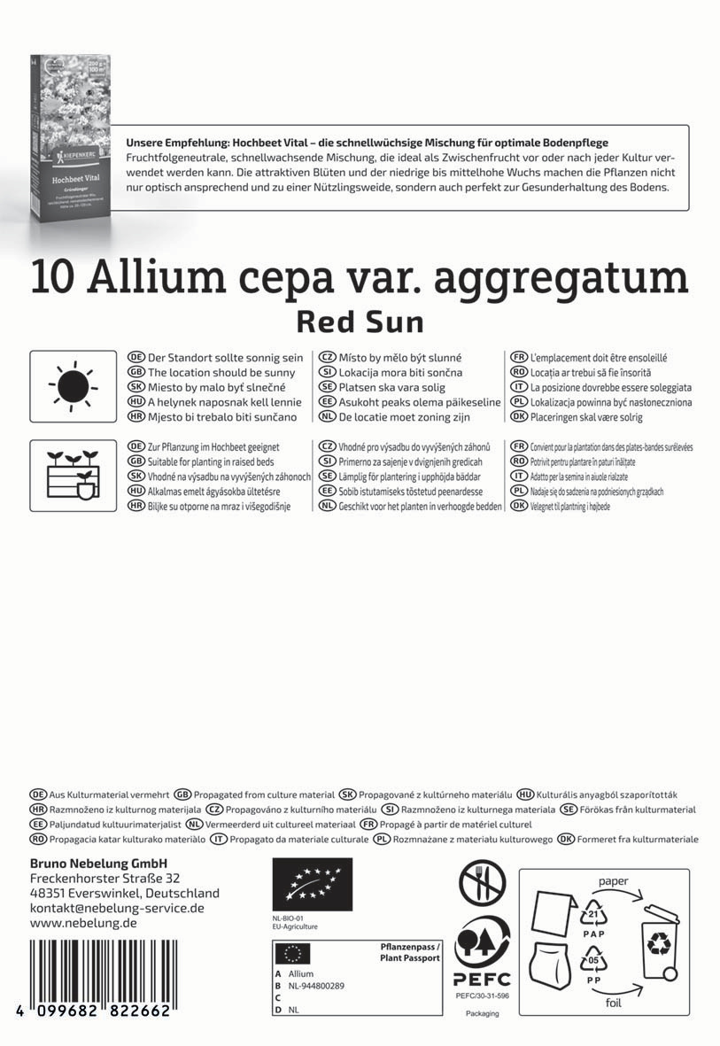 Red Sun' ist eine Bio-Schalotte mit roter Schale und einem herzhaften Aroma. Die Sorte liefert hohe Erträge und kann gut gelagert werden, falls sie nicht direkt frisch Verwendung findet. Nach dem Stecken der Zwiebeln im März oder April an einem sonnigen Standort ist es wichtig, diese gut zu bewässern.Der Unterschied zwischen Zwiebeln und Schalotten, liegt in ihrer Größe sowie Form. Anders als die Steckzwiebeln, wachsen die Schalotten in Horsten, die später aus mehreren Zwiebeln bestehen. Die Schalotten sind daher kleiner und je nach Sorte rund oder oval-länglich. Mit nur einer gesteckten Pflanzschalotte ernten Sie also später mehrere Zwiebeln. Schalotten sind etwas würziger und feiner im Aroma, süßlicher im Geschmack, milder und weniger beißend als die bekannten Küchenzwiebeln.