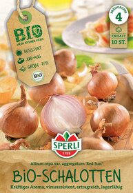 Eine rote Schalotte in bester Bio-Qualität mit etwas kräftigerem, herzhaften Aroma ist die BIO-Schalotte 'Red Sun'. Sie ist virusresistent und sehr ertragreich. Hinzu kommt, dass sie gut lagerfähig ist. Für den Frischverzehr sind die Zwiebel und das Blatt im Juni und Juli besonders geeignet.Der Unterschied zwischen Zwiebeln und Schalotten, liegt in ihrer Größe sowie Form. Anders als die Steckzwiebeln, wachsen die Schalotten in Horsten, die später aus mehreren Zwiebeln bestehen. Die Schalotten sind daher kleiner und je nach Sorte rund oder oval-länglich. Mit nur einer gesteckten Pflanzschalotte erntest Du also später mehrere Zwiebeln. Schalotten sind etwas würziger und feiner im Aroma, süßlicher im Geschmack, milder und weniger beißend als die bekannten Küchenzwiebeln.
