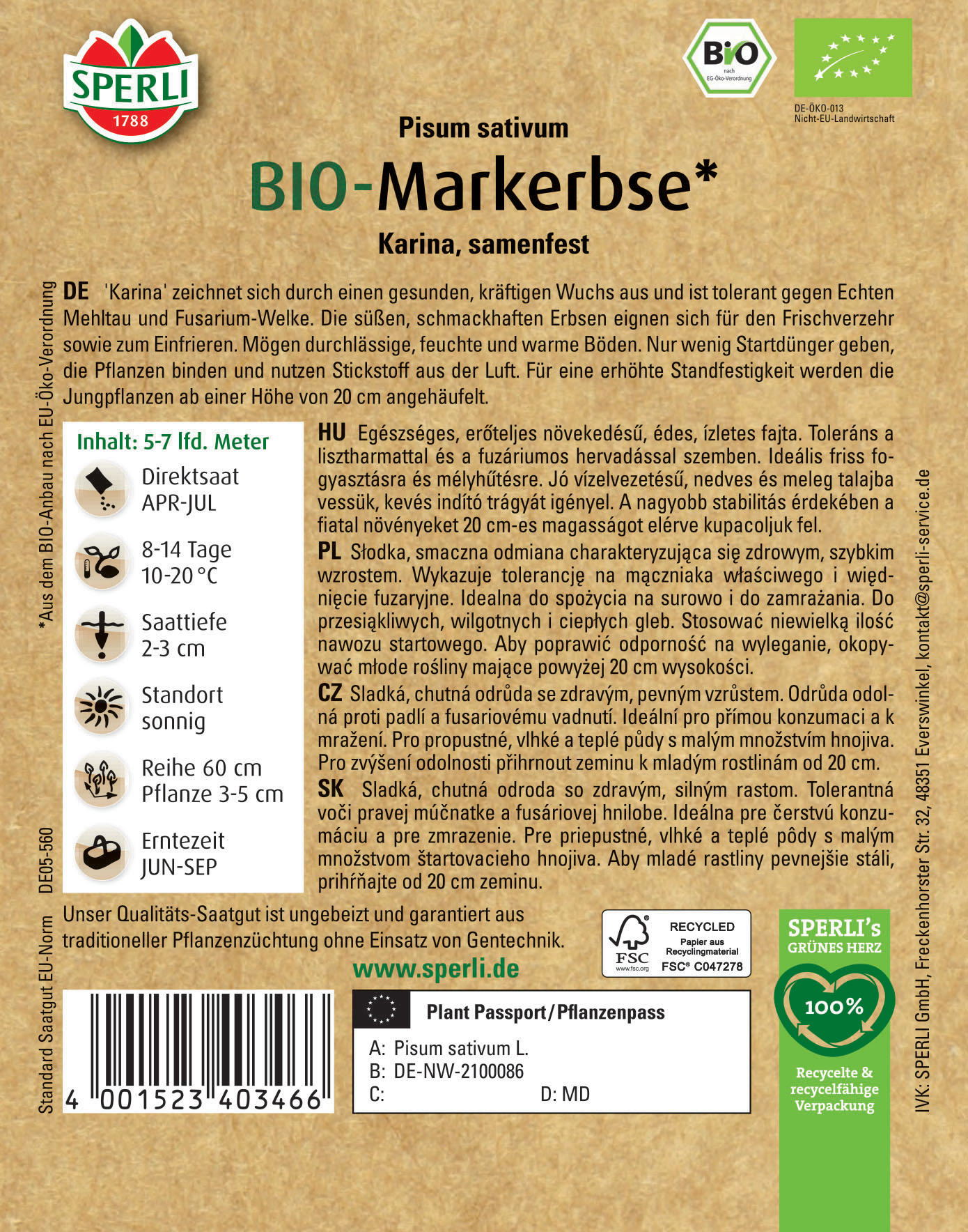 Bei der BIO-Markerbse 'Karina' von SPERLI handelt es sich um eine Sorte mit süßen, zarten Erbsenkörnern, die gesund und kräftig wächst und von Juni bis September über einen langen Zeitraum geerntet werden kann. 'Karina' ist außerdem besonders tolerant gegen die Fusariumwelke und den Echten Mehltau. Das Saatgut in BIO-Qualität wird zwischen April und Juli an einem sonnigen Standort ausgebracht, idealerweise in einen durchlässigen, warmen und feuchten Boden. Werden die Pflanzen bei einer Wuchshöhe von ca. 20 angehäufelt, sind sie ausreichend standsicher, um auf bis zu 80 cm anzuwachsen. Die äußerst schmackhaften Erbsen eignen sich nach der Ernte sowohl zum Naschen als auch zum Frosten.Kurzbezeichnung : | BIO Sommermarkerbse Karina |