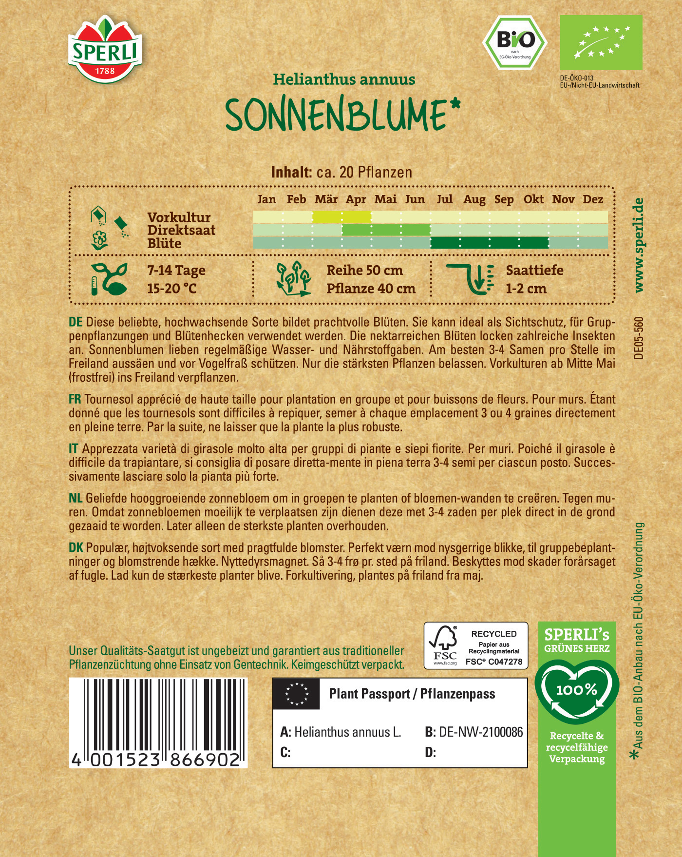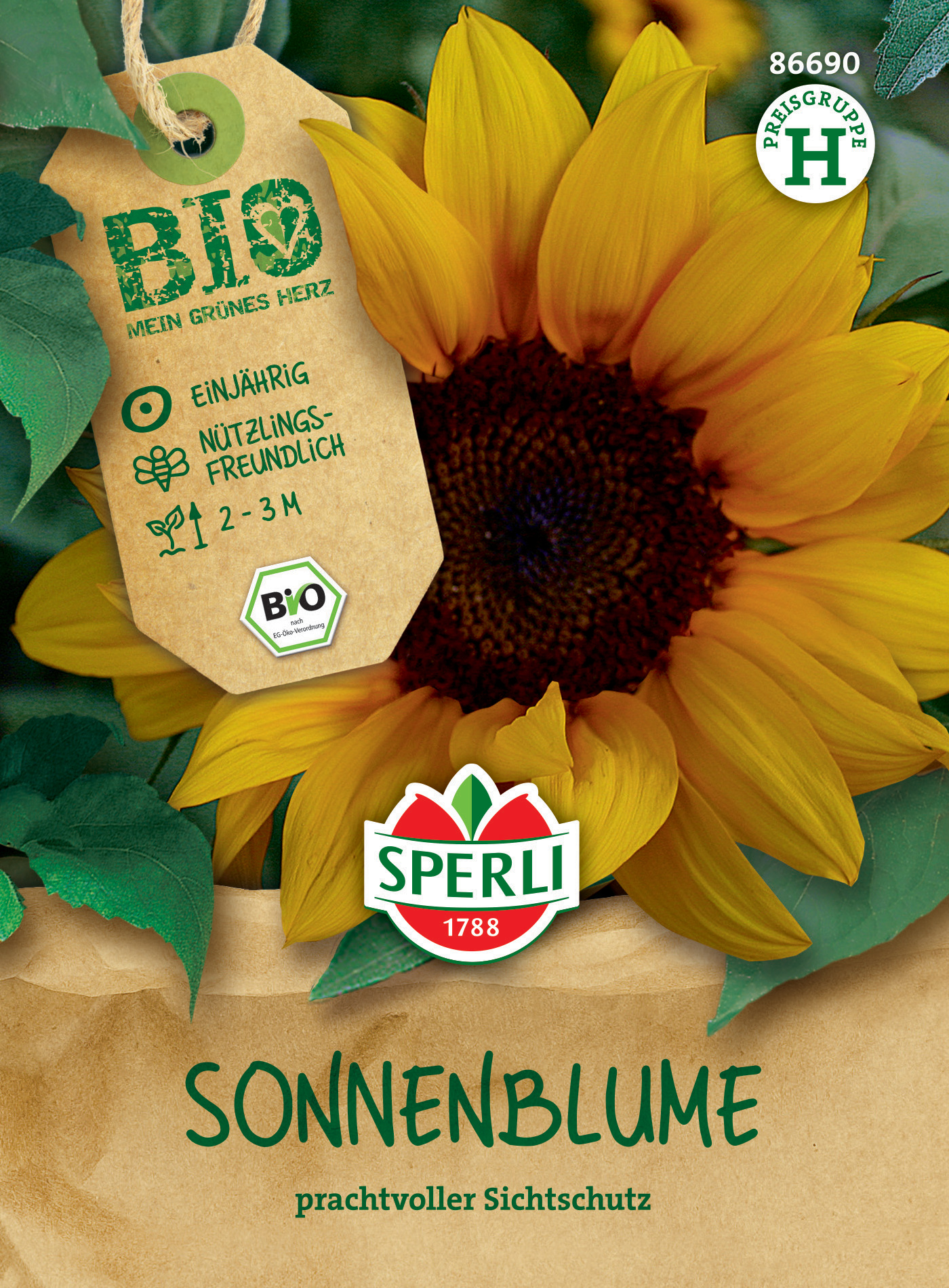 Die Sonnenblumen lieben nahrhaften kräftigen Boden mit ausreichend Flüssigkeit, damit sie zu diesen gigantischen Schönheiten heranwachsen können. Bei doppelter Samenstärke, die Du zwischen April und Mai auslegst, bilden sie eine Gruppe von prachtvollen Blüten heraus, die Deine Gartenmauern zieren oder als Sichtschutz dienen können. Die bezaubernde Sonnenblume ist zudem eine schmackhafte Nahrungsquelle für Insekten, und auch uns Menschen versorgt sie mit Leckerbissen: Die kleinen Sonnenblumenkerne sind der ideale Snack für unterwegs und machen sich super in frischen Sommersalaten.| Kurzbezeichnung : | BIO Sonnenblume |