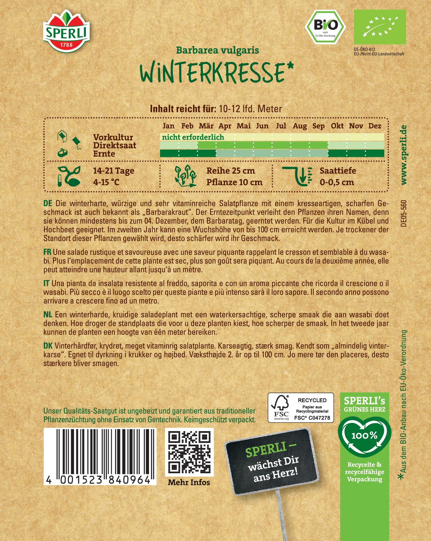 Die mehrjährige, samenfeste BIO-Winterkresse ist eine winterharte Pflanze, welche Du vom Herbst mindestens bis zum Barbaratag am 4. Dezember und je nach Witterung sogar bis in den März hinein ernten kannst. Ein sonniger oder halbschattiger Platz ist für die Anzucht ideal, wobei gilt: Je trockener der Standort, desto schärfer wird der Geschmack der BIO-Winterkresse.
