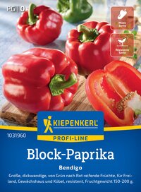 Die Blockpaprika 'Bendigo' ist eine attraktive und schmackhafte Paprika-Sorte, die beeindruckend große, dickwandige Früchte hervorbringt. Diese reifen von einem kräftigen Grün zu einem satten Rot und wiegen zwischen 150 und 200 g. Das würzige Aroma der frischen Paprika entwickelt sich beim Reifen zu einer köstlichen süßlichen Note. Diese frühe Gartensorte eignet sich hervorragend für geschützte Lagen im Freiland, in Gewächshäusern, Hochbeeten und Kübeln. Mit einer Wuchshöhe von 80-100 cm wird sie schnell zum Blickfang in jedem Garten. Freuen Sie sich auf eine ertragreiche Ernte und die köstlichen Aromen, die die 'Bendigo' in Ihre Küche bringt. Diese vielseitigen Paprika sind ideal zum Füllen, Grillen oder einfach als frischer Snack – sie bereichern Ihre Mahlzeiten mit Geschmack und gesundheitlichen Vorteilen. Lassen Sie sich von dieser robusten Sorte inspirieren! Entdecken Sie die Blockpaprika 'Bendigo' und genießen Sie ihre knackigen, köstlichen Früchte!| Kurzbezeichnung : | Block-Paprika Bendigo, F1 |