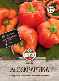 Die Paprika 'Priscila' von SPERLI ist eine F1-Hybride, deren blockige Früchte mittelfrüh heranreifen, eine leuchtend rote Farbe haben und ca. 200 g schwer werden. Im Geschmack sind sie saftig-süß. Ihre dicke Fruchtwand wird Dich vor allem bei der Verwendung als rohes Gemüse begeistern.