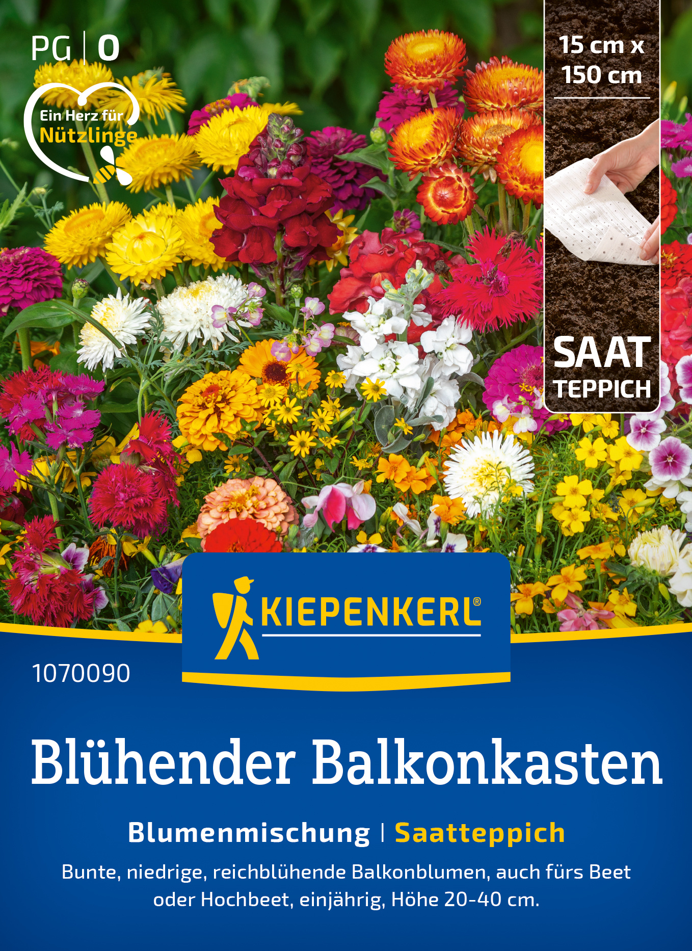 Die Mischung 'Blütenreicher Balkonkasten' verwandelt jeden Balkon in eine blühende Oase. Diese bunten, niedrigen und reichblühenden Sommerblumen sorgen von Juni bis zum Frost für einen üppigen Flor. Ideal für Kästen, Hochbeete oder als Einfassung im Garten — diese Mischung bietet nicht nur einen visuellen Anblick, sondern zieht auch Insekten an. Genießen Sie die Vielfalt und Farbenpracht dieser herrlichen Mischung, die Ihre Außenbereiche in ein blühendes Paradies verwandelt! Diese einjährigen Pflanzen mit einer Höhe von 20-40 cm sind eine großartige Möglichkeit, um neue Gartenideen auszuprobieren und Ihre kreative Seite auszuleben. Entwickeln Sie eine blühende Vielfalt auf Ihrem Balkon und erfreuen Sie sich an der Frische des Sommers| Kurzbezeichnung : | Blumenmischung Blütenreicher Balkonkasten, Saatteppich |