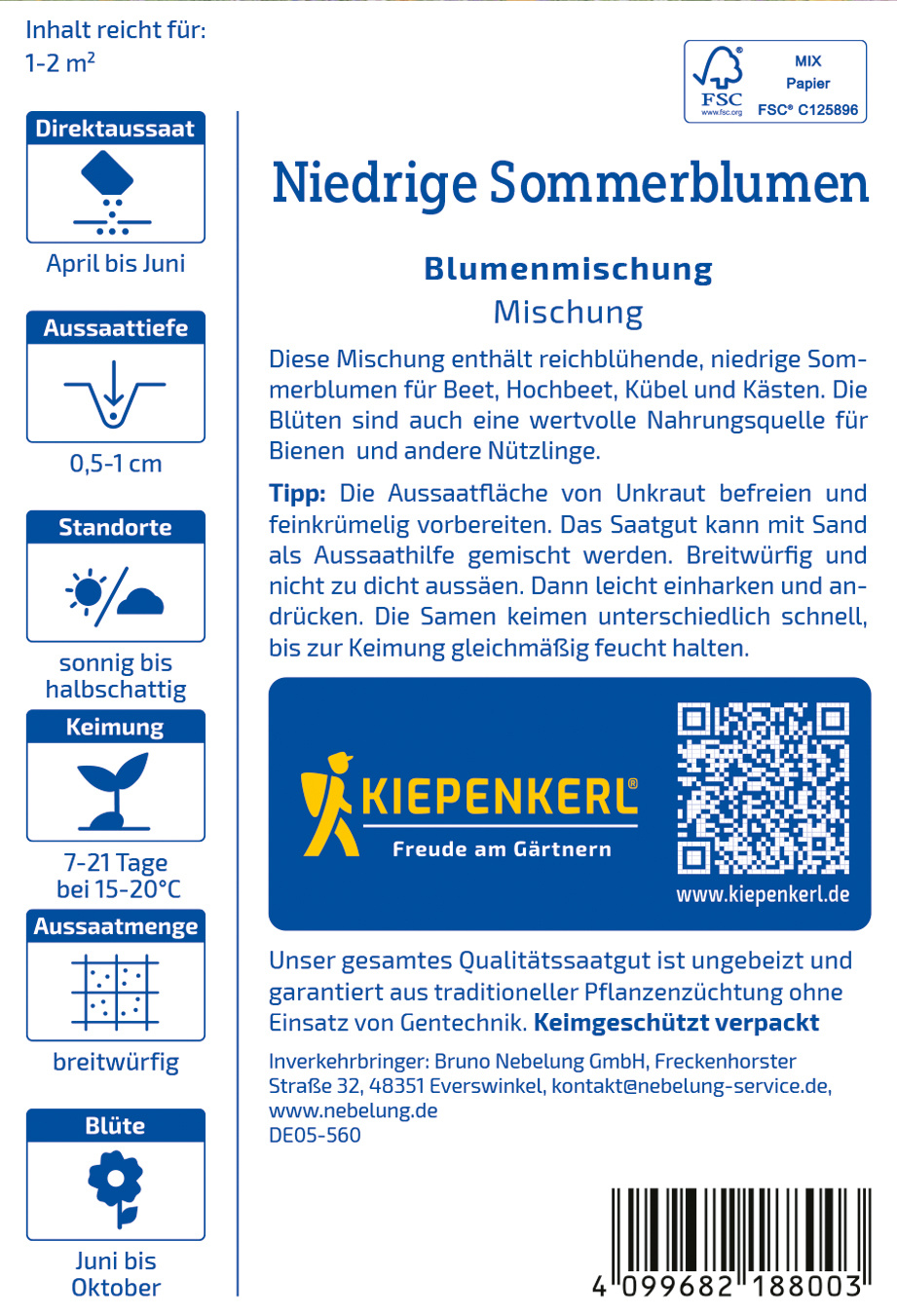 Erleben Sie ein wahres Farbenmeer mit unserer bunten Mischung aus reichblühenden, niedrigen Sommerblumen! Diese einjährigen Schönheiten sind ideal für Beete, Hochbeete, Kübel und Kästen und zaubern eine lebendige Atmosphäre in Ihren Garten. Mit einer Höhe von 20 bis 30 cm bringen sie nicht nur Freude, sondern bieten auch wertvolle Nahrungsquellen für Bienen und Nützlinge, was das ökologische Gleichgewicht in Ihrem Außenbereich fördert. Genießen Sie die Vielfalt und die mühelose Anpflanzung dieser farbenfrohen Blumen, die Ihre Gartenlandschaft in ein blühendes Insektenparadies verwandeln. Setzen Sie kreative Akzente und erfreuen Sie sich an den leuchtenden Farben, die Ihr Freiluft-Wohnzimmer erstrahlen lassen! Lassen Sie sich von der natürlichen Schönheit inspirieren und schaffen Sie einen Rückzugsort voller Leben und Freude. Handeln Sie jetzt und verwandeln Sie Ihren Garten mit dieser großartigen Mischung!| Kurzbezeichnung : | Blumenmischung Niedrige Sommerblumen |