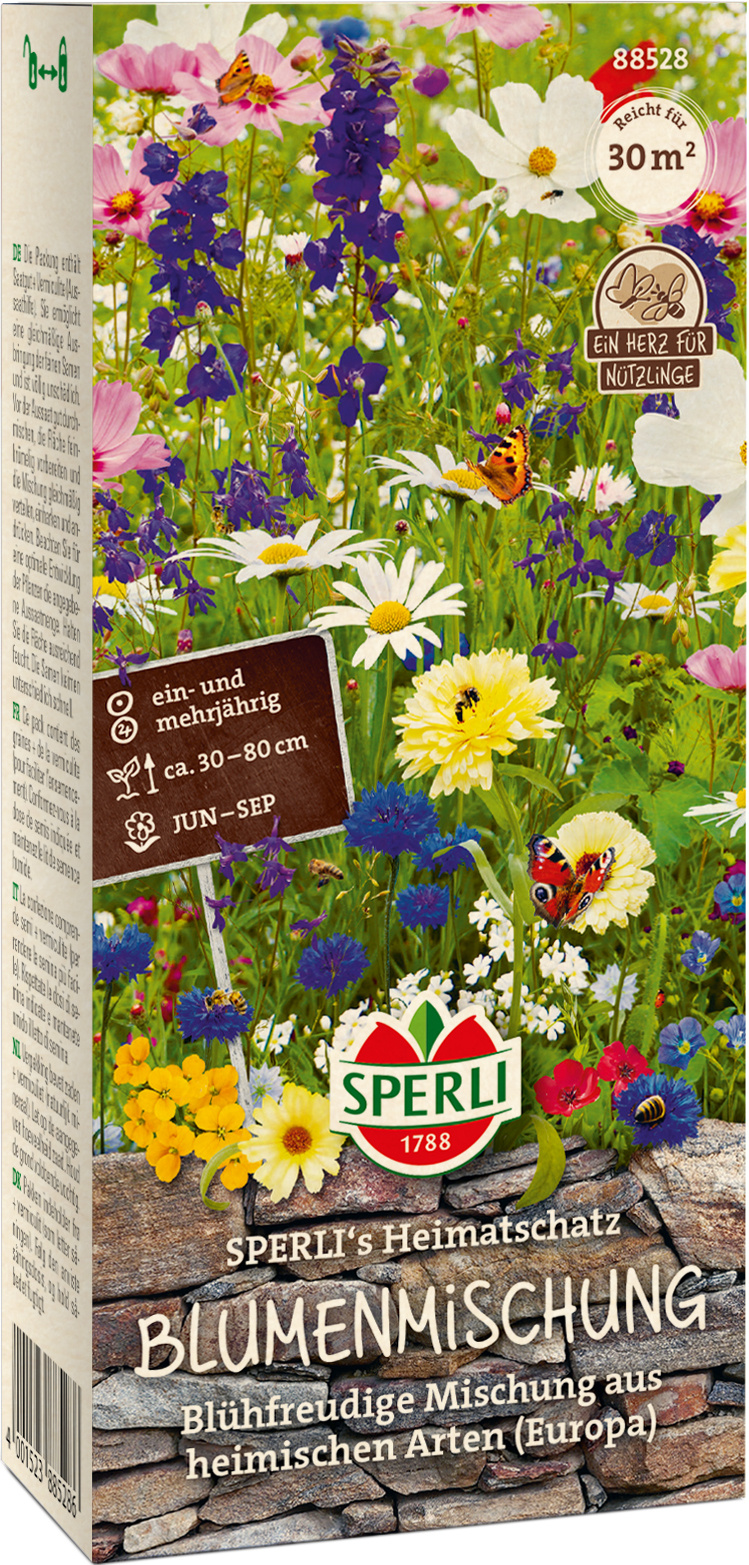 Die blühfreudige Blumenmischung „SPERLI's Heimatschatz“ lässt einen Blütenflor aus heimischen Blumenarten erstrahlen. Die bunte Blütenvielfalt dieser ein- und mehrjährigen Mischung wird bis zu 80 cm hoch. Nicht umsonst ist diese Mischung mit dem „Herz für Nützlinge“ gekennzeichnet. So bietet sie vielen Insekten Nahrung und Unterschlupf.