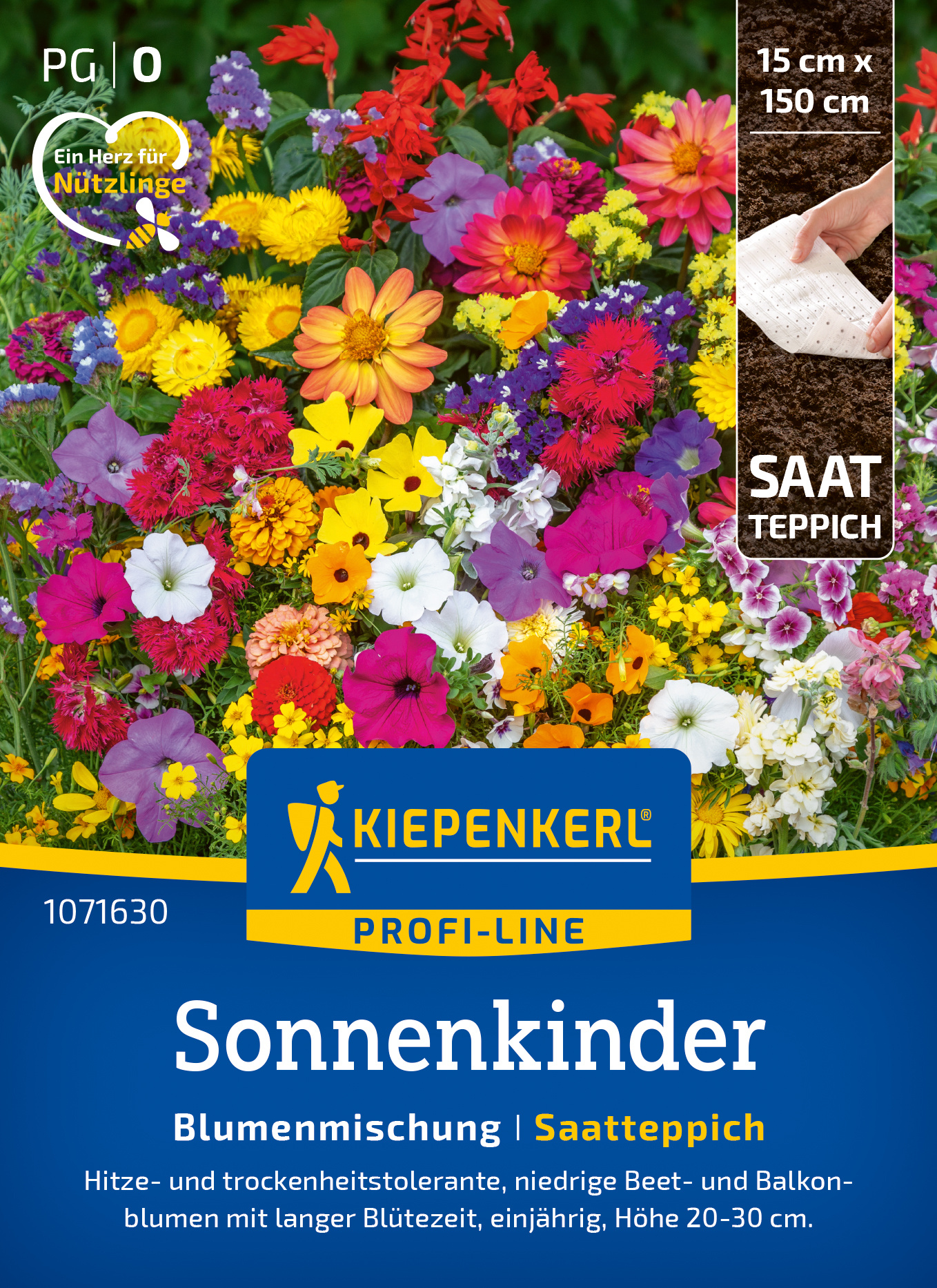 Verleihen Sie Ihrem Garten mit den 'Pflegeleichten Sonnenkindern' einen fröhlichen Akzent! Diese niedrigen, blühfreudigen Sommerblumen sind hitze- und trockenheitstolerant. Sie sind ideal für Kübel und Beete und benötigen wenig Aufmerksamkeit. Erfreuen Sie sich an einer blühenden Gartenlandschaft, die gleichzeitig viele Insekten anzieht. Diese pflegeleichte Mischung bringt visuelle Vielfalt und Freude in jede Gartensaison. Entfalten Sie die Pracht der 'Pflegeleichten Sonnenkinder' in Ihrem Garten!| Kurzbezeichnung : | Blumenmischung Sonnenkinder, Saatteppich |