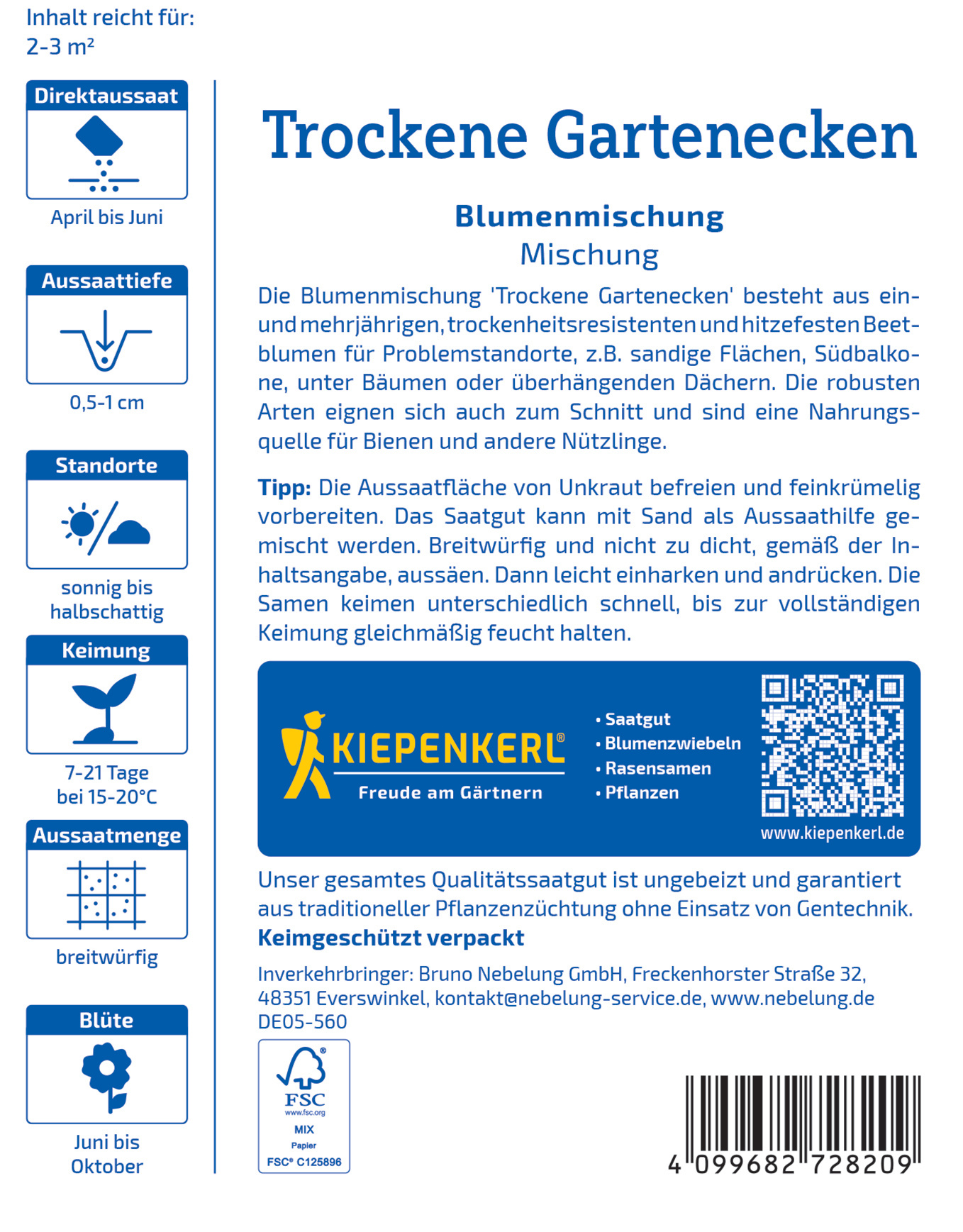 Gestalten Sie herausfordernde Standortbedingungen in Ihrem Garten mit dieser speziellen Mischung für trockene Gartenecken! Sie vereint ein- und mehrjährige, trockenheitsresistente Beetblumen, die sich hervorragend für sandige Böden und Südbalkone eignen. Diese Pflanzen sind wahre Überlebenskünstler und gedeihen unter extremen Bedingungen. Die ausgewählten Blumen überzeugen durch ihre Robustheit und Schönheit. Sie entwickeln sich prächtig in schattigen Bereichen und bringen Leben in sonnige Lagen. Mit minimalem Pflegeaufwand blühen diese Pflanzen über die Sommermonate und locken zahlreiche Nützlinge an. Verleihen Sie Ihrem Garten mit dieser Mischung neuen Glanz!| Kurzbezeichnung : | Blumenmischung Trockene Gartenecken |