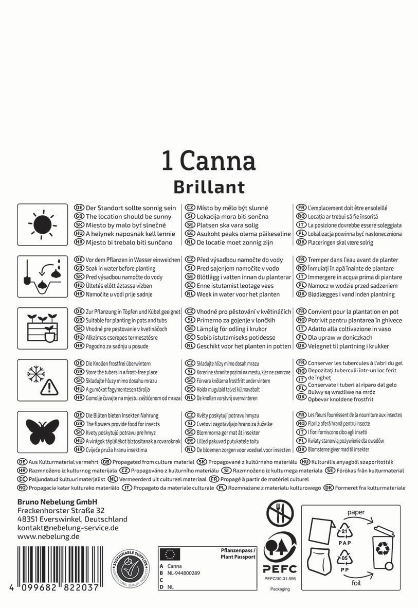 Die Canna `Brillant` ist eine auffällige und eindrucksvolle Canna-Sorte, die mit ihren leuchtend roten Blüten und den kräftig dunkelroten Stielen einen markanten Kontrast zu den grünen, bananenähnlichen Blättern bildet. Diese Sorte erreicht eine Höhe von bis zu 90 cm und bringt tropisches Flair in den Garten, auf die Terrasse oder den Balkon.Auch die Canna `Brillant` gedeiht am besten an einem sonnigen Standort und benötigt reichlich Wärme, um ihre volle Blütenpracht zu entfalten. Sie ist perfekt für Kübel und größere Pflanzgefäße geeignet und lässt sich wunderbar in Kombination mit anderen Sommerblumen wie Dahlien, Lilien oder Gladiolen einsetzen. Regelmäßige Wassergaben sind wichtig, da die Pflanze während der Wachstums- und Blütezeit einen erhöhten Bedarf hat. Um das Wachstum zu fördern, empfiehlt sich eine monatliche Düngung.