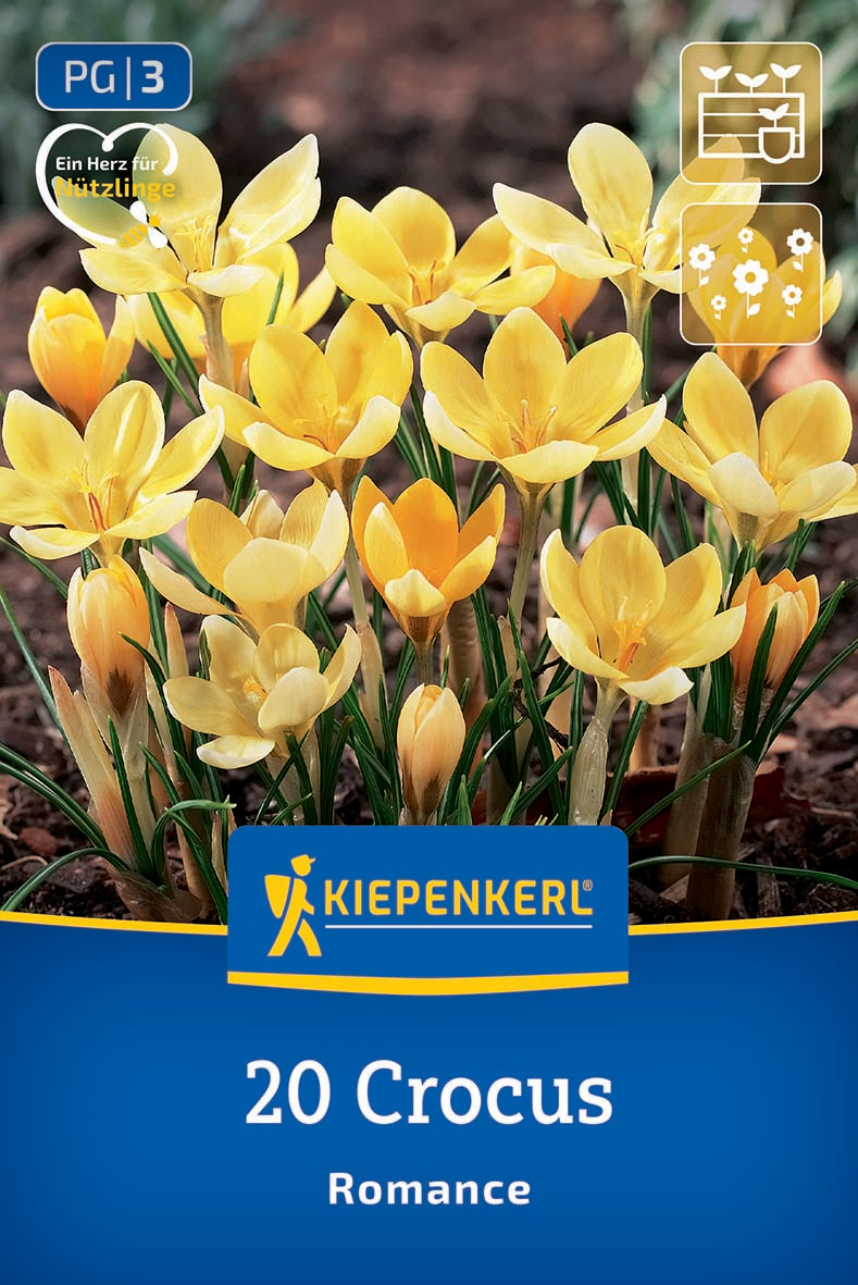 Der mehrjährige Wildkrokus 'Romance' bringt sehr viel Blühfreude in Blumenbeete und Pflanzkübel. Die intensiv-cremefarbenen Blüten ziehen Blicke und Insekten magisch an: So bieten sie in ihrer Blüte von Februar bis März wichtigen Nektar für Nützlinge. Die Blumen werden ca. 10 cm hoch und verwildern sehr gut.