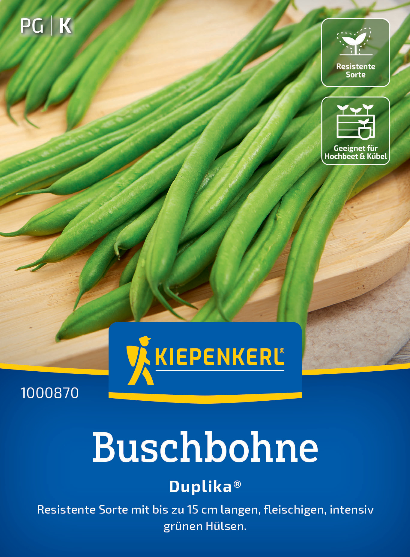Die Buschbohne 'Duplika®' bringt runde, fleischige, fadenloseca, 15 cm lange Hülsen, ideal für den Verzehr. Diese Sorte ist bekannt für ihre Resistenz gegen Krankheiten und sorgt für mühelose Ernte. Bohnen nicht roh verzehren, zur Konservierung blanchieren und einfrieren. Sie binden Stickstoff aus der Luft und sind dadurch wichtig für die Fruchtfolge. Buschbohnen gedeihen auch im Hochbeet und in großen Kübeln. Wuchshöhe ca. 55 cm. Ihre einfache Pflege und rasches Wachstum bieten Ihnen schmackhafte Erträge. Erleben Sie die Vorzüge der Buschbohne 'Duplika®'!| Kurzbezeichnung : | Buschbohne Duplika® |