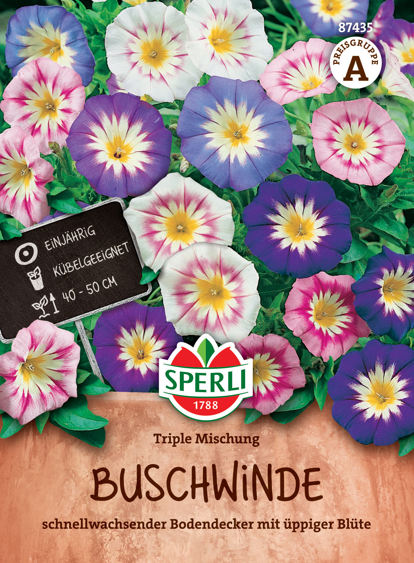 SPERLI's Triple Mischung enthält einjährige, verschiedenfarbige, üppig blühende Winden mit buschigem Wuchs und trichterförmigen Blüten in den Farben Rosa bis Lila mit weiß-gelbem Schlund. Bestens geeignet als Bodendecker zur Begrünung kahler Flächen, aber auch als Rabattenpflanze und für Balkonkästen und Kübel. Höhe: 150 cm.| Kurzbezeichnung : | Buschwinde Triple Mischung |